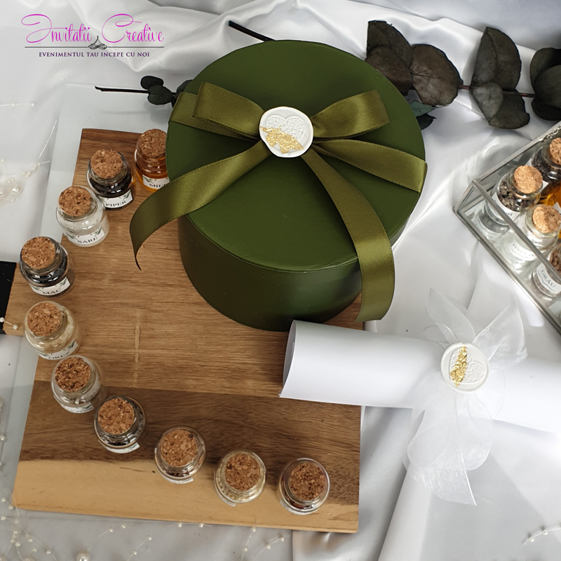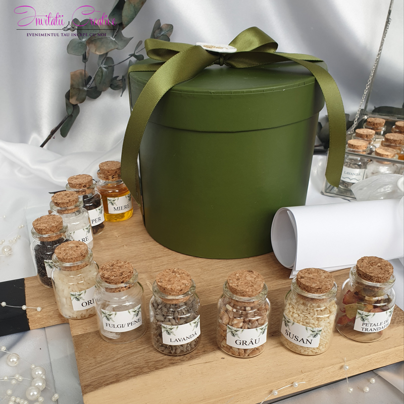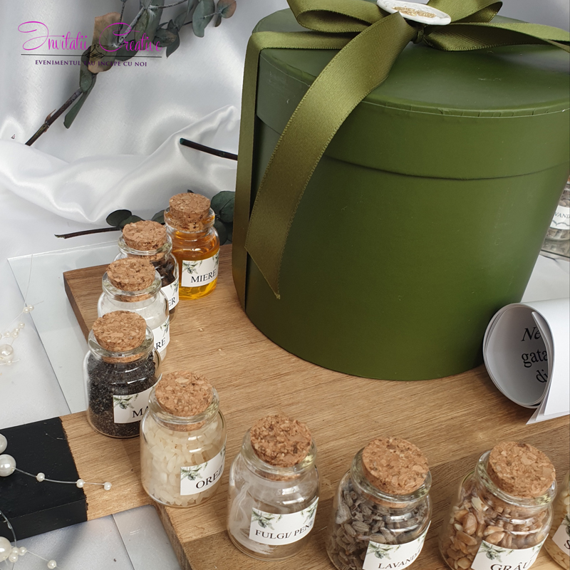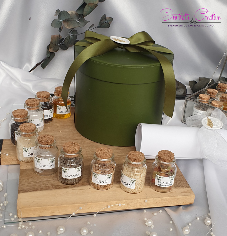 Cutiuta cu mirodenii pentru Baita de a doua zi verde olive este destinat utilizării în cadrul ritualului tradițional pentru baita de mir, desfășurat a doua zi după botez. Acest ritual este un moment plin de simbolism și emoție, în care copilul este curățat și binecuvântat, de nasi pentru a începe viața cu noroc, binecuvantare si sanatate.