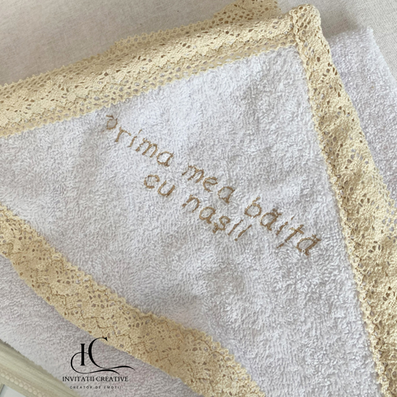 Dimensiunea aproximativa a prosopului este de 75 cm x 100 cm. Prosopul are un capison personalizat cu mesajul Prima mea baita cu nasii.