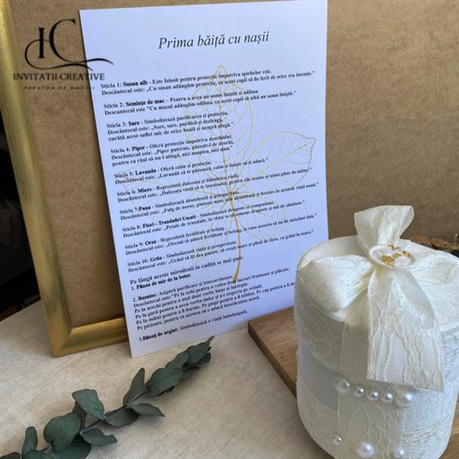 Set deluxe ivoire 1 mirodenii prima baita cu nasii este destinat utilizării în cadrul ritualului tradițional pentru baita de mir, desfășurat a doua zi după botez. Acest ritual este un moment plin de simbolism și emoție, în care copilul este curățat și binecuvântat, de nasi pentru a începe viața cu noroc, binecuvantare si sanatate.