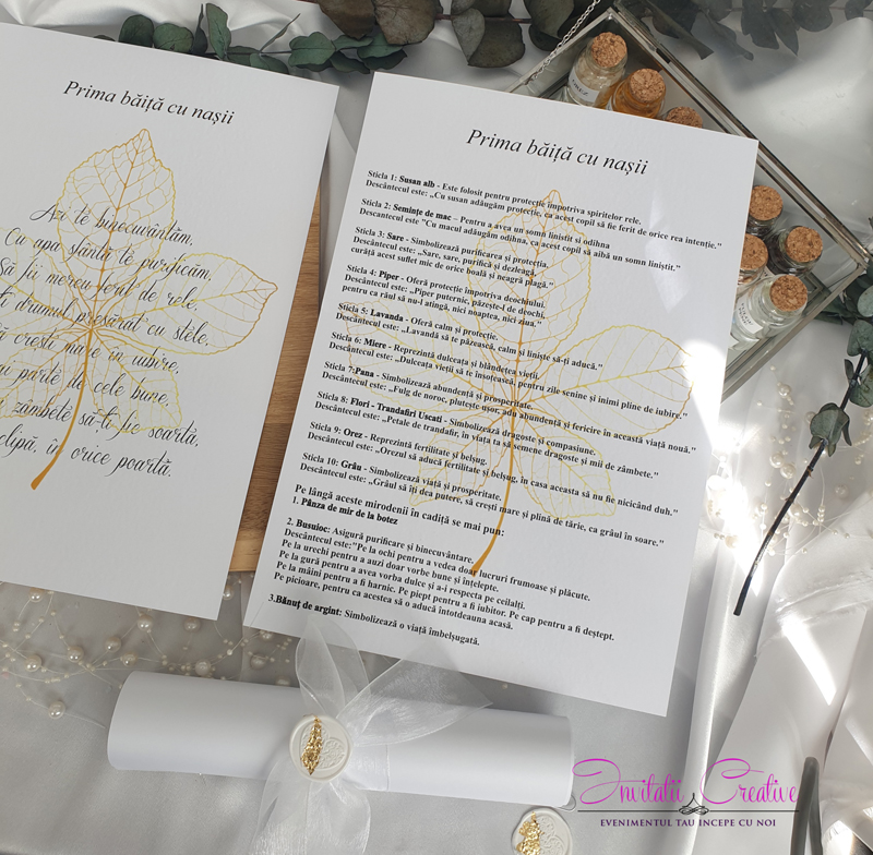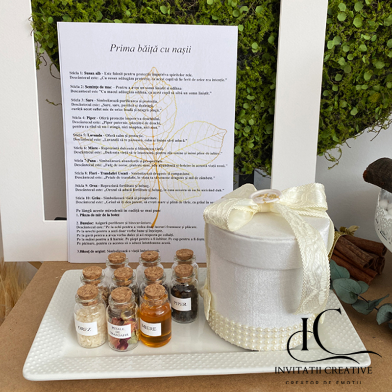 Set deluxe ivoire 2 mirodenii prima baita cu nasii este destinat utilizării în cadrul ritualului tradițional pentru baita de mir, desfășurat a doua zi după botez. Acest ritual este un moment plin de simbolism și emoție, în care copilul este curățat și binecuvântat, de nasi pentru a începe viața cu noroc, binecuvantare si sanatate.