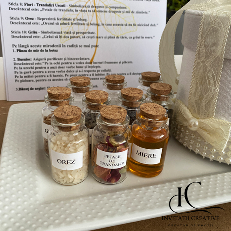 Acest set de mirodenii va transforma ceremonia băiței de mir într-un moment special și plin de iubire si va ajuta nasii cu ghidul complet al elementelor necesare. Instructiunile vă vor îndruma prin toți pașii necesari pentru a desfășura acest ritual tradițional românesc cu bucurie și ușurință.