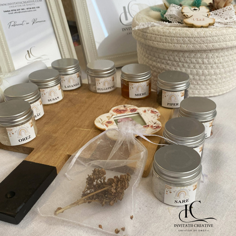 Setul de mirodenii pentru prima băiță cu nașii este un cadou de suflet. Este creat pentru a păstra vie tradiția românească a băiței de după botez.