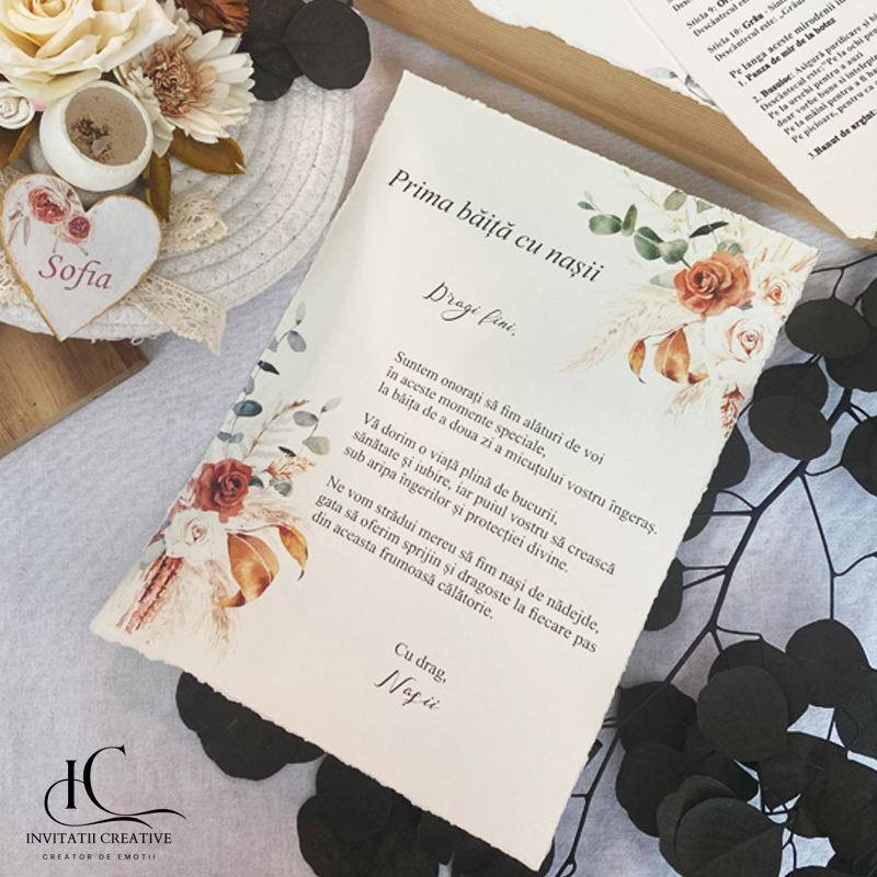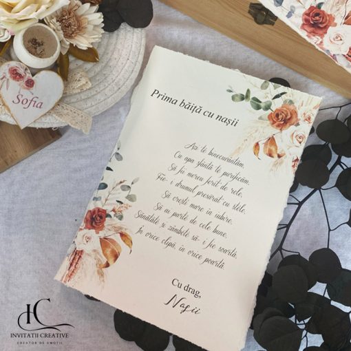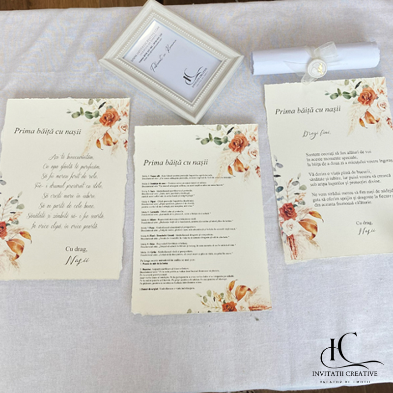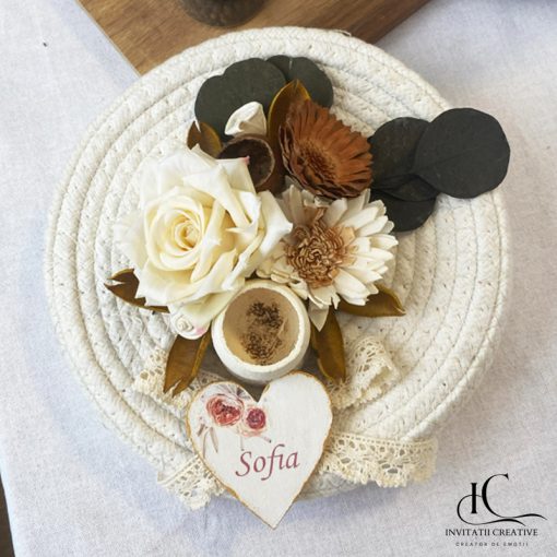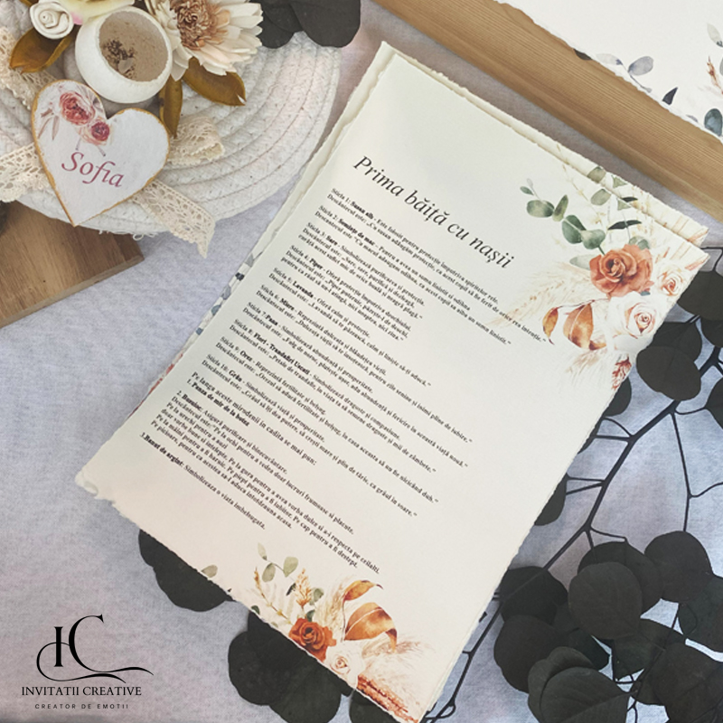 Fiecare detaliu este atent lucrat, de la coșurile naturale din iută, bumbac sau iarbă de mare, decorate cu plante uscate și flori stabilizate. Iar papirusurile sunt franjurate manual și sigilate cu ceară. Întregul set transmite eleganță, naturalețe și respect pentru tradiție.