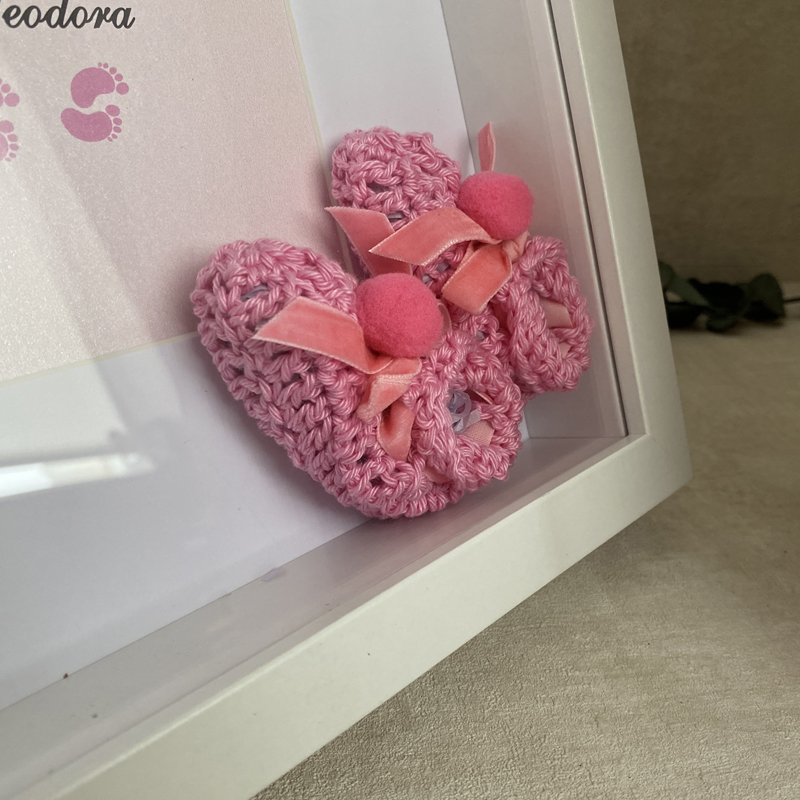 Cadou de cerere pentru a fi nasi de botez – tablou personalizat cu botoșei croșetați