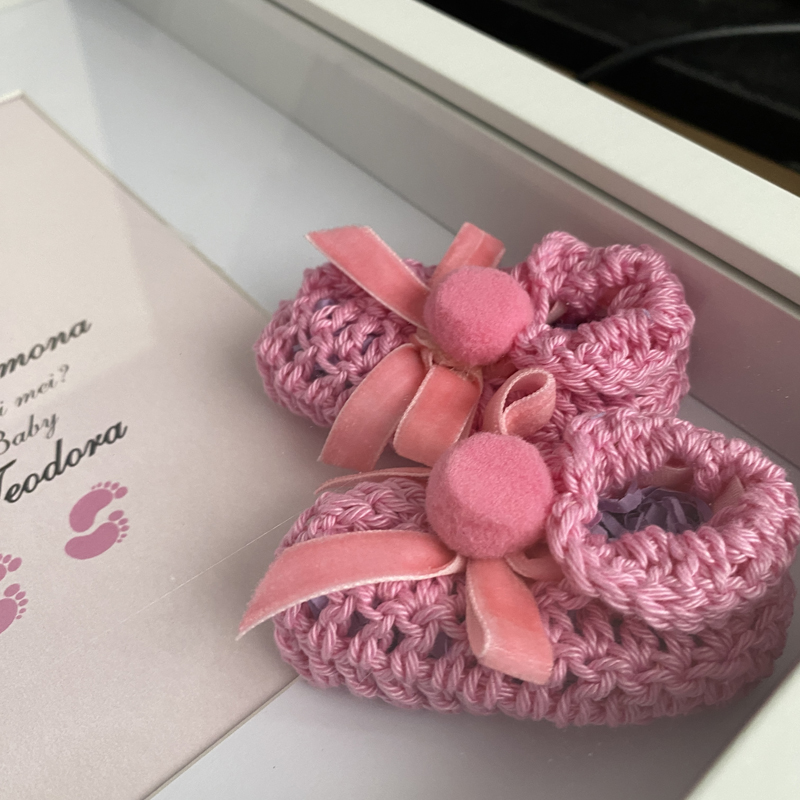 - Botoșei croșetați manual, simbol al începutului de drum și al pașilor mici, dar plini de speranță.