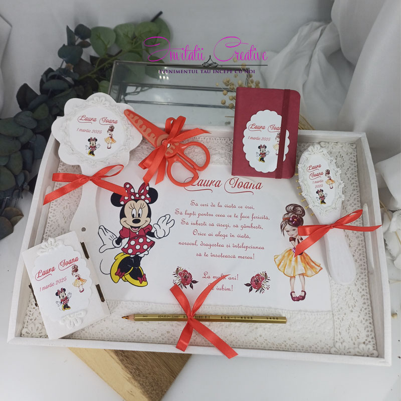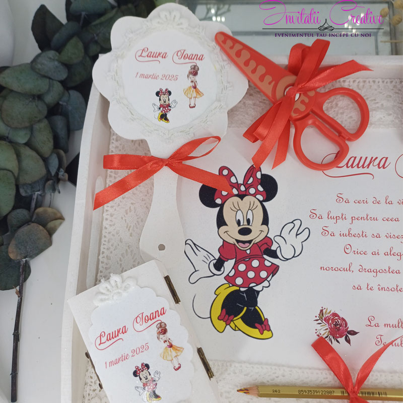 Tavita Mot-Turta Personalizata cu Minnie mouse Rosu si Fetita