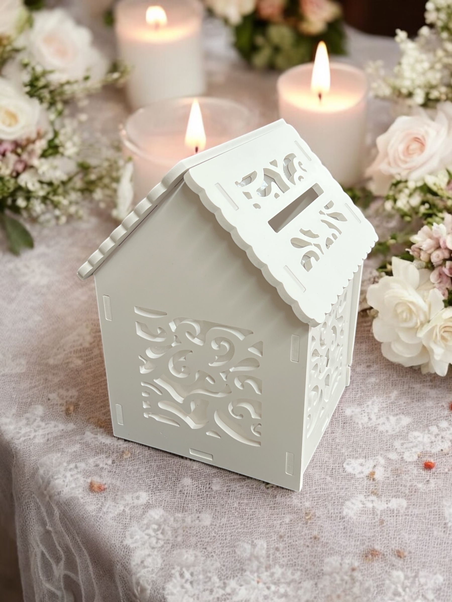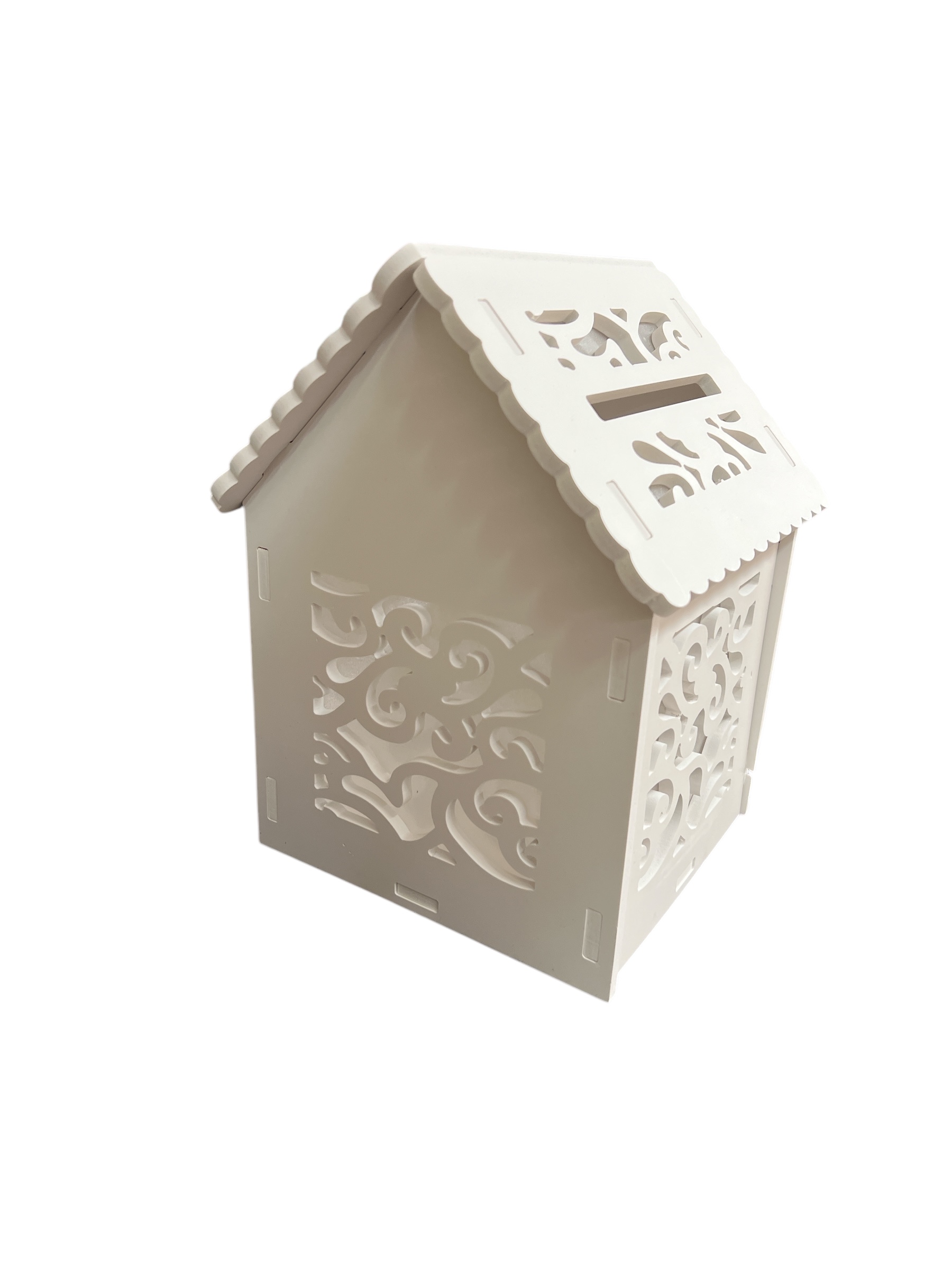 Îmbogățește evenimentul tău special cu această cutie de daruri elegantă in forma de casuta, decorată cu un design dantelat. Casuta are inaltimea de 31,5 cm, latimea de 26 cm si lungimea de 39 cm. Se folosesc la botezuri sau nunti pentru plicurile cu dar.