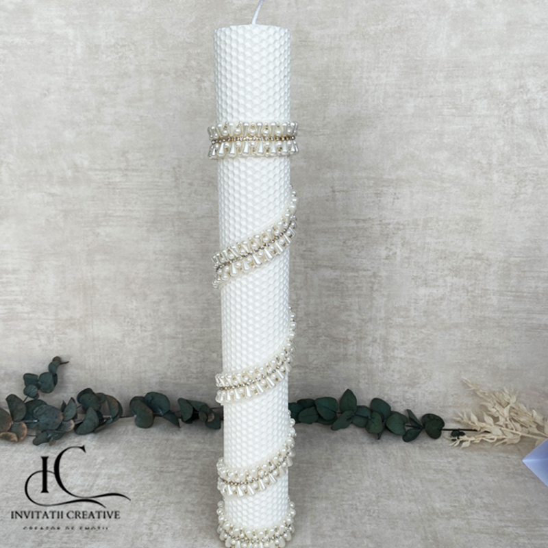 Perlele elegant in spirala adaugă un detaliu stilat, păstrând totodată o estetică minimalistă și proaspătă si confera ideea de dragoste infinita. Perfectă pentru cei care iubesc rafinamentul în simplitate. Această lumânare devine un simbol al luminii, al binecuvântării și al iubirii ce înconjoară fiecare suflet mic la început de drum.