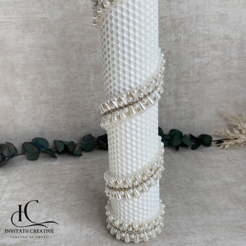 Realizată sub formă de fagure, cu miros subtil de miere și decorată manual cu perle si strasuri deosebite. Această lumânare oferă rafinament și autenticitate.