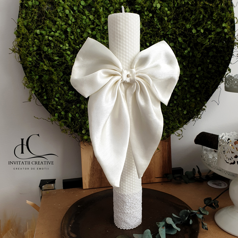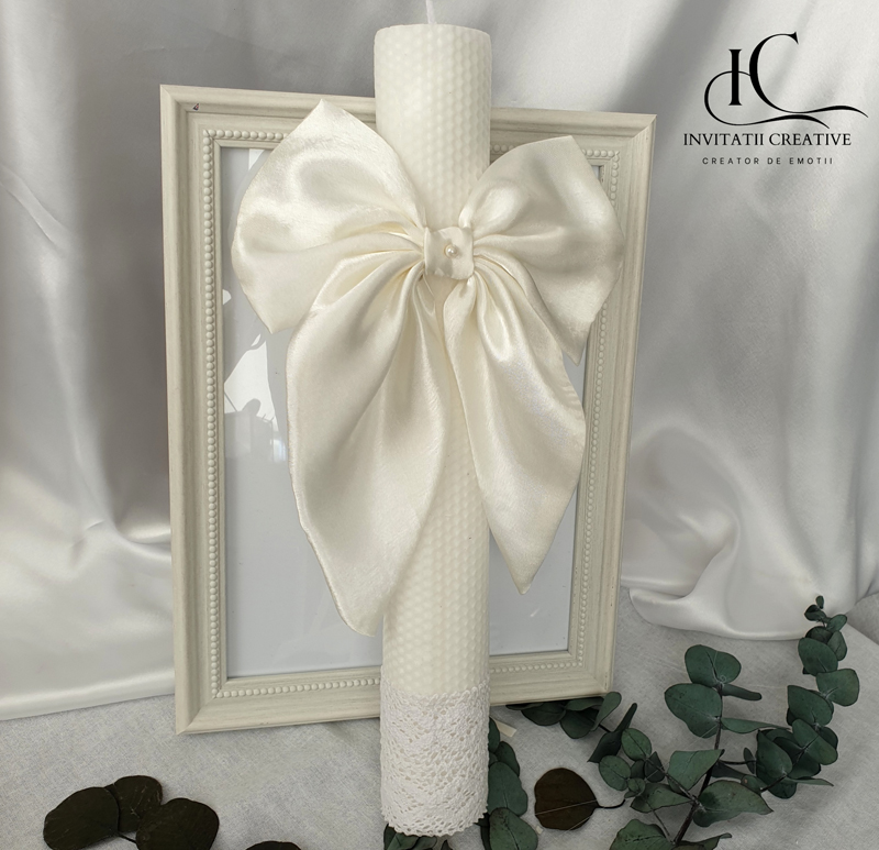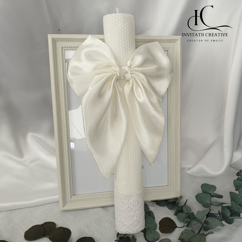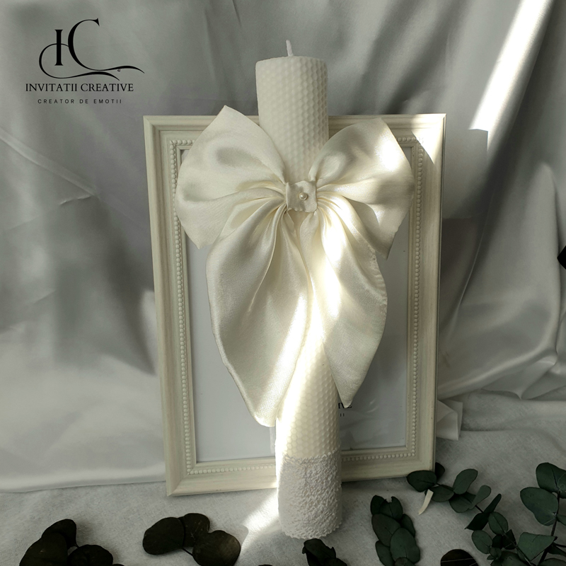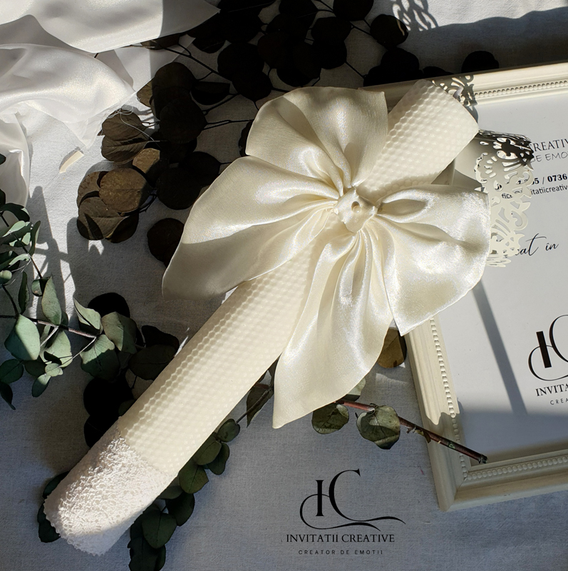 Lumânare de botez din ceară naturală de albine – un accesoriu elegant, artizanal, perfect pentru ceremonia voastra.