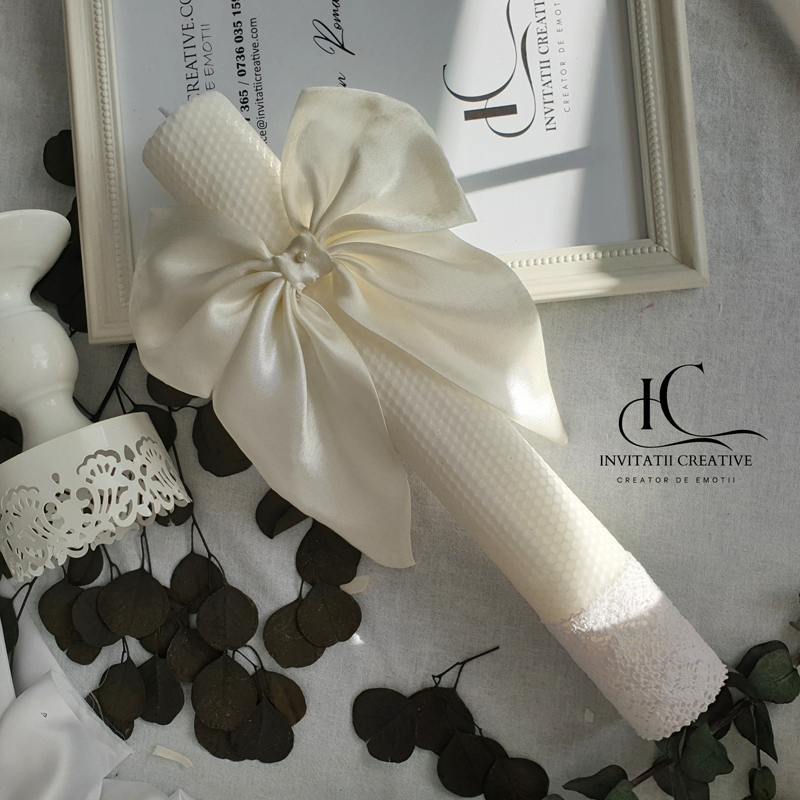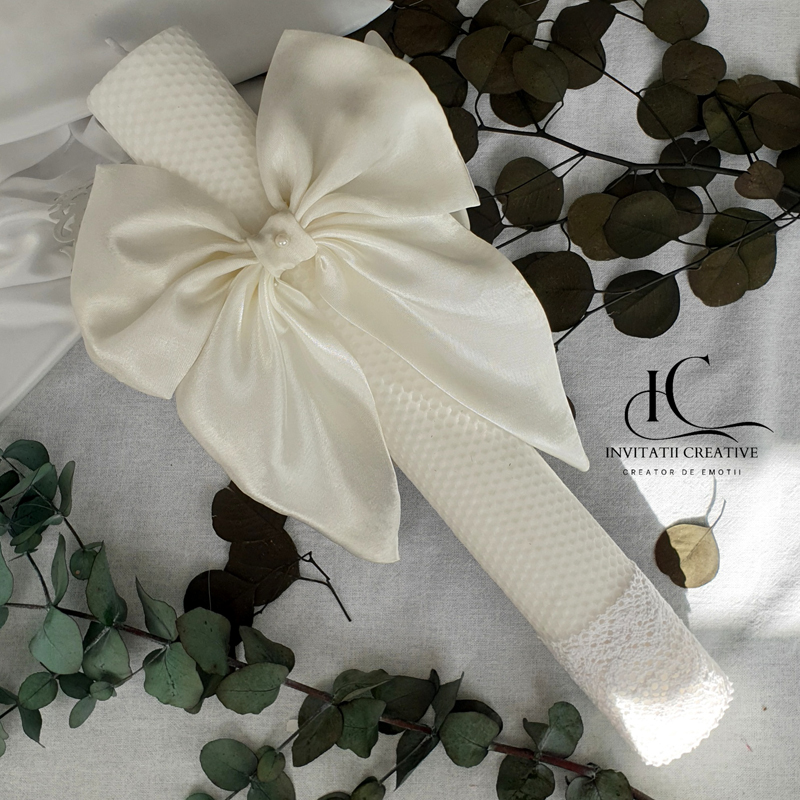 Creată manual cu grijă și inspirație, Lumanarea nunta cu funda diafana din satin ivoire îmbină puritatea albului cu un accent natural de ivoire, simbolizând începutul plin de speranță al unei vieți noi.