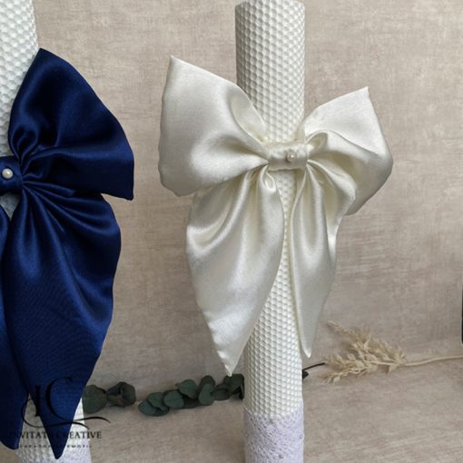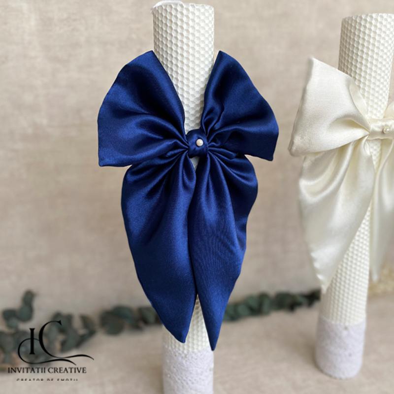 Create manual cu grijă și inspirație, Set 2 Lumanari nunta cu funda diafana din satin ivoire si bleumarin îmbină puritatea albului cu un accent natural de ivoire, simbolizând începutul plin de speranță al unei vieți noi.