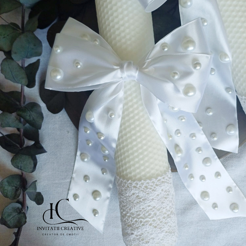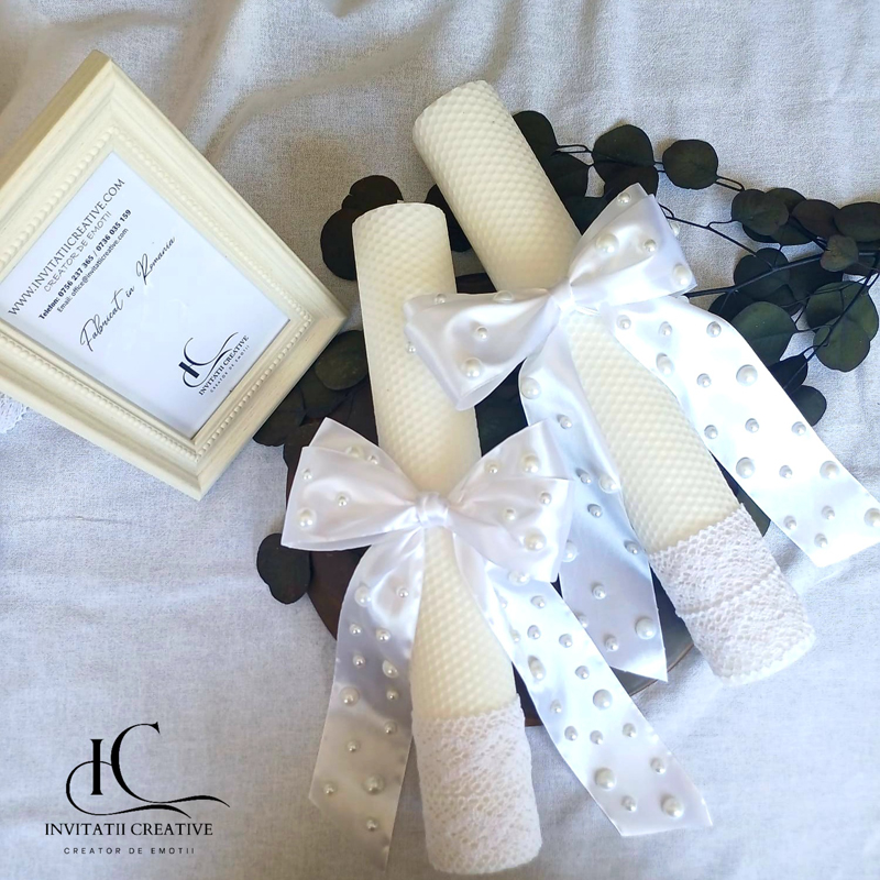 Set lumanari ceara albine pentru nunta cu perle