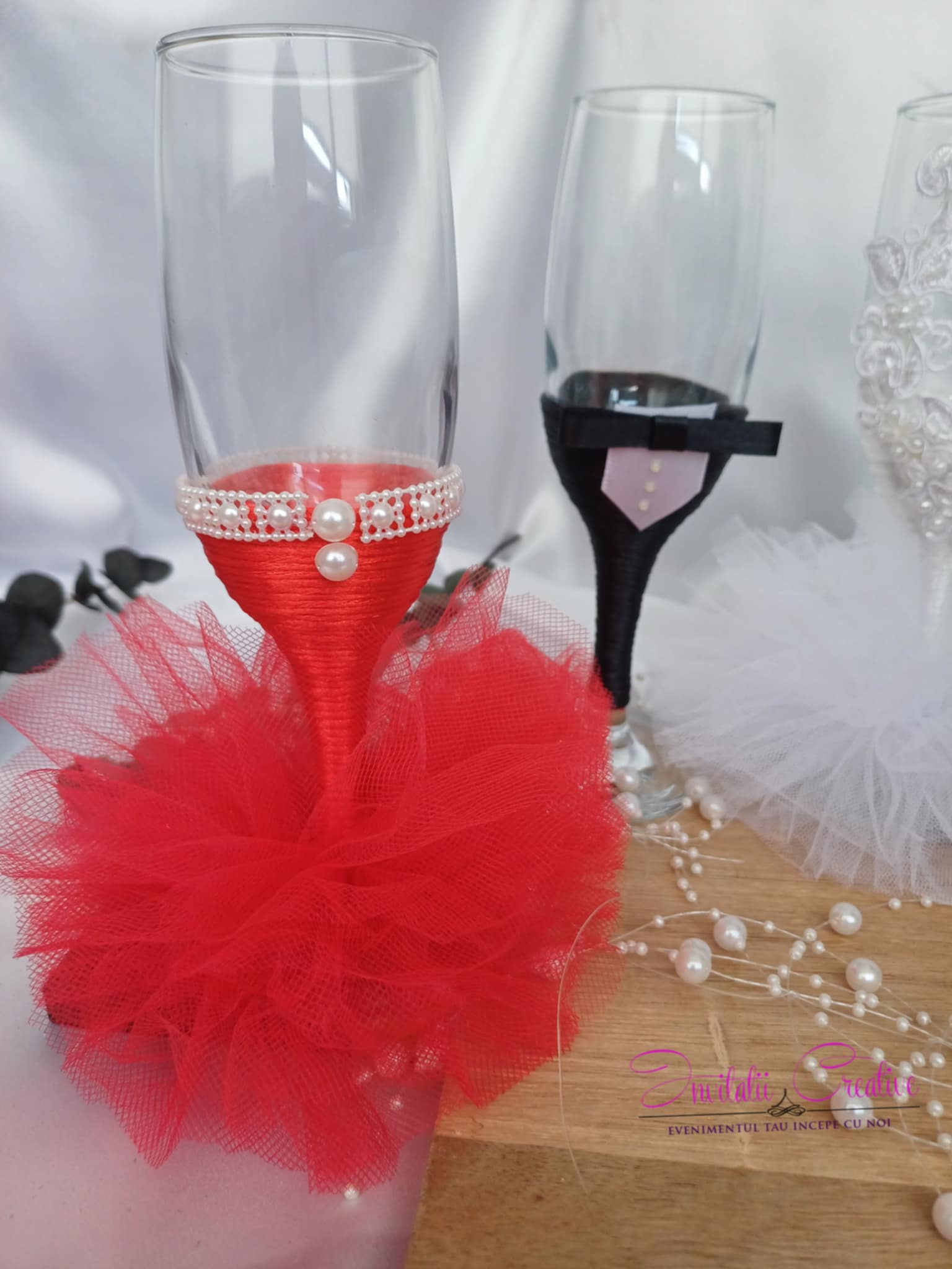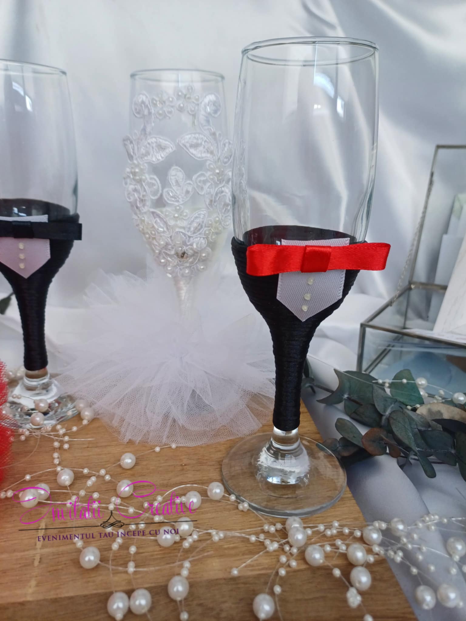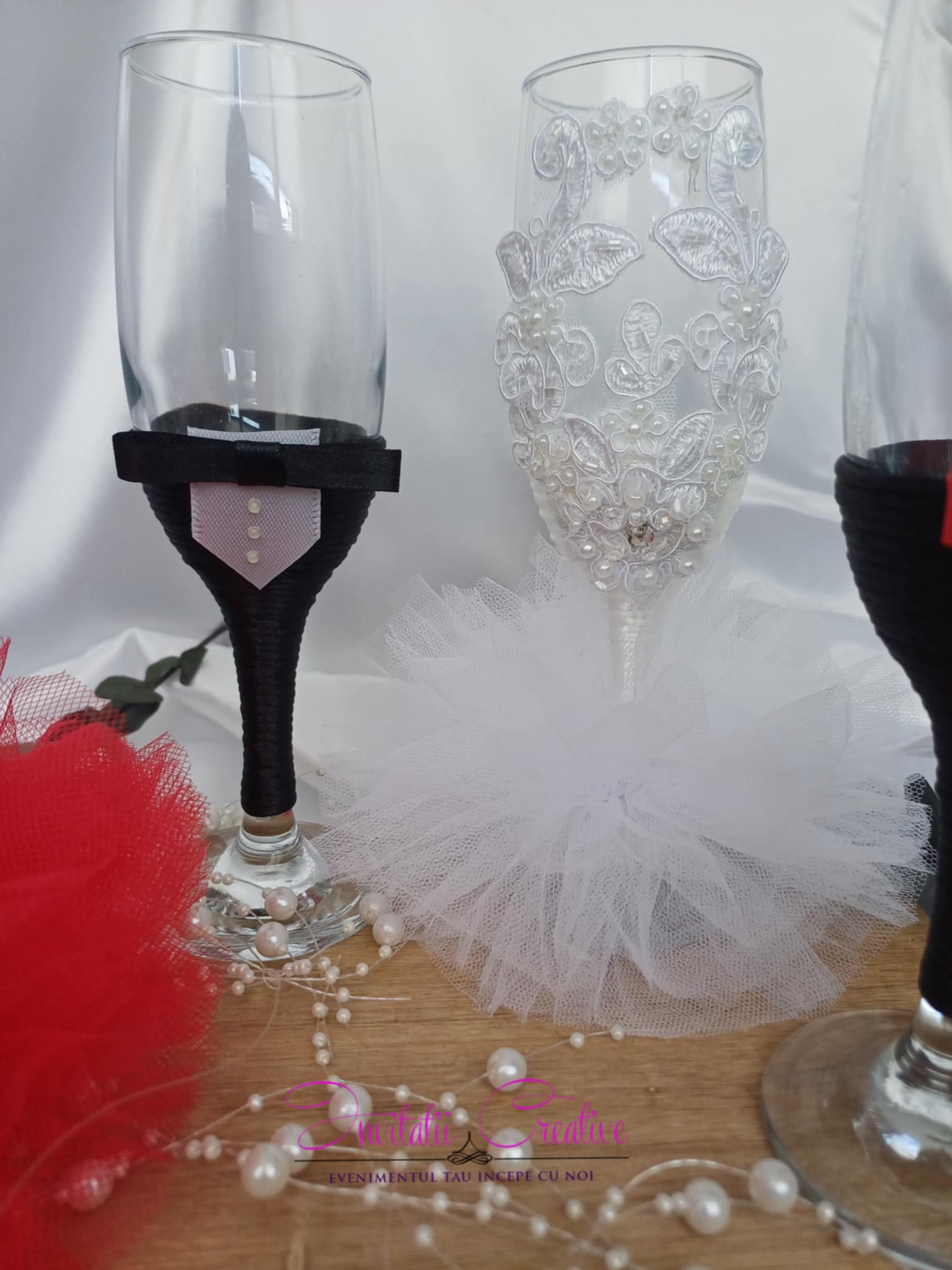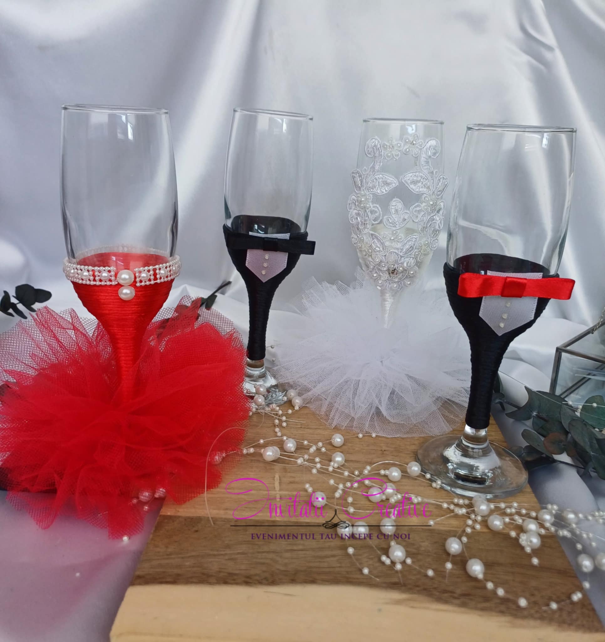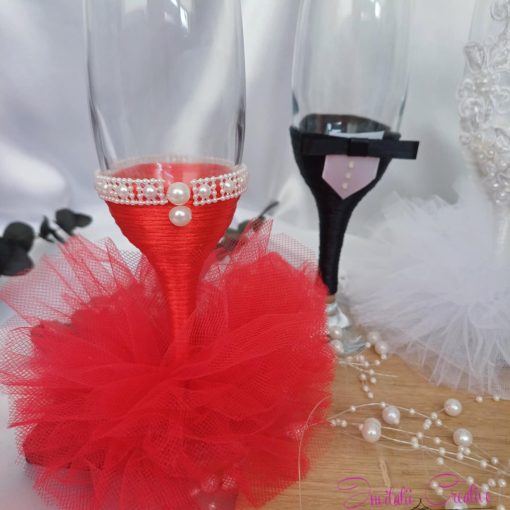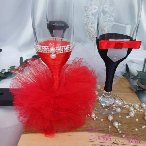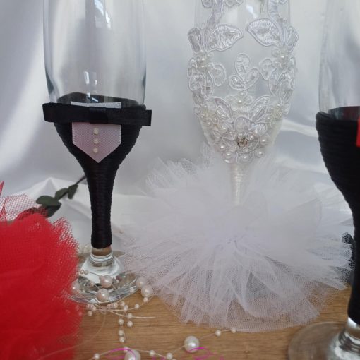 Paharele de sampanie pentru miri si nasi sunt decorate elegant cu snur alb, pentru mireasa, mov, pentru nasa si negru, pentru mire si nasi. Mireasa si nasele au o fustita, iar paharele sunt decorate cu dantela si accesorii. Mirele si nasii au papioane asortate cu perechea.