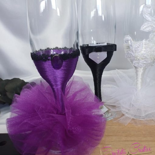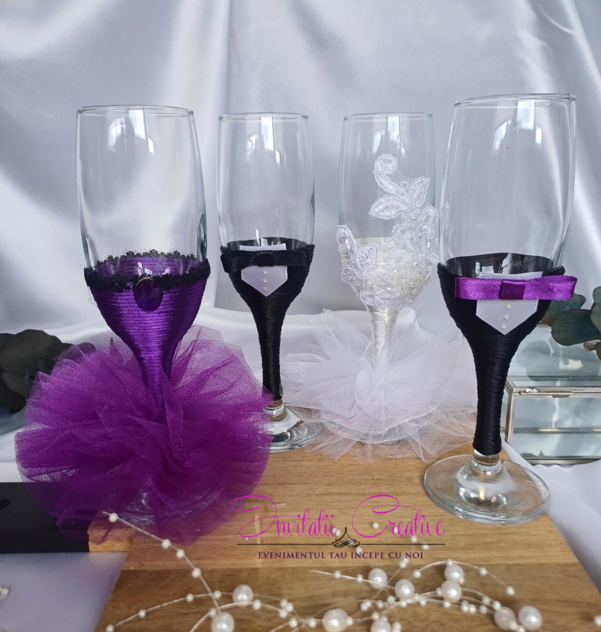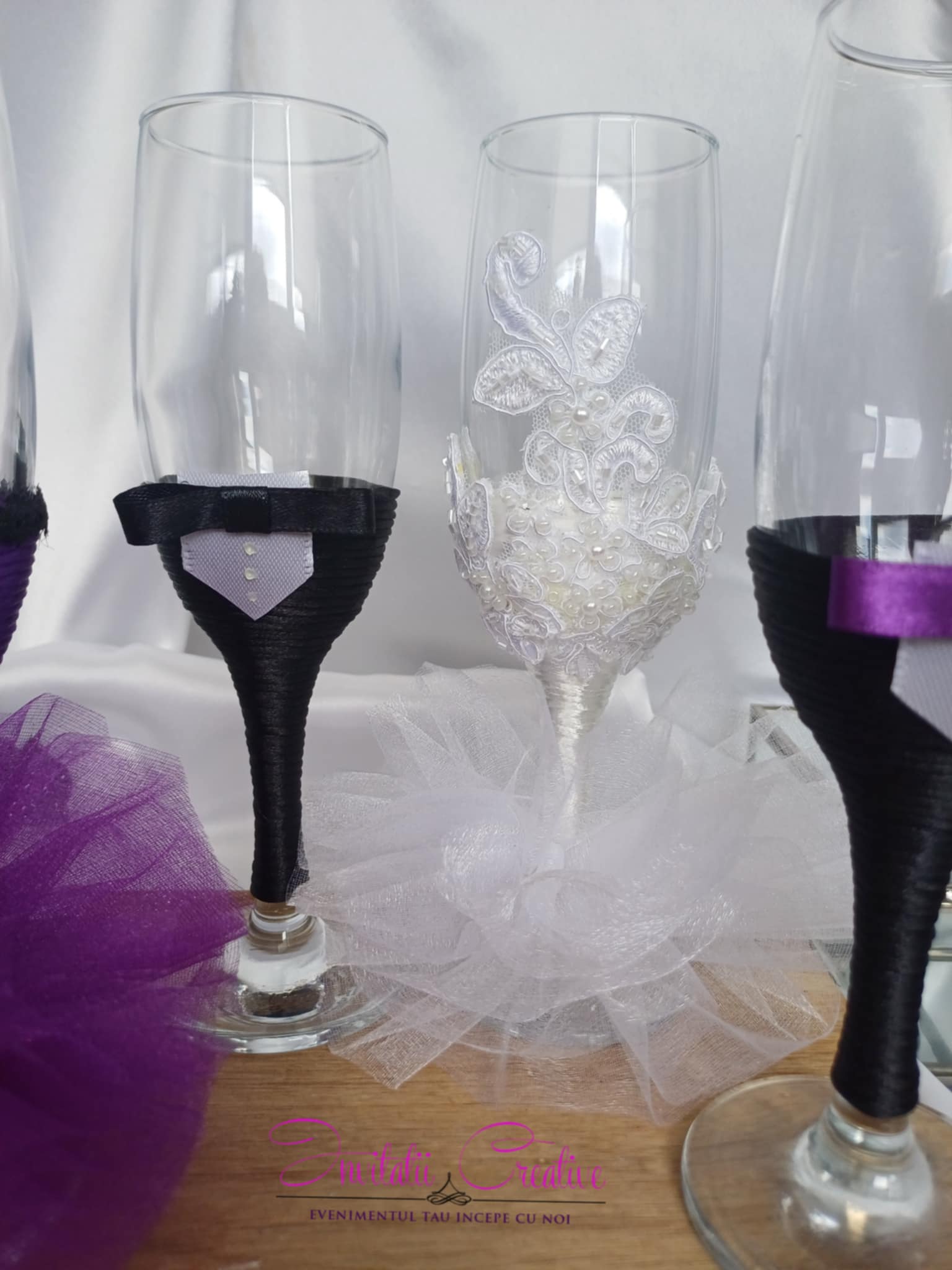 Paharele de sampanie pentru miri si nasi sunt decorate elegant cu snur alb, pentru mireasa, mov, pentru nasa si negru, pentru mire si nasi. Mireasa si nasele au o fustita, iar paharele sunt decorate cu dantela si accesorii. Mirele si nasii au papioane asortate cu perechea.