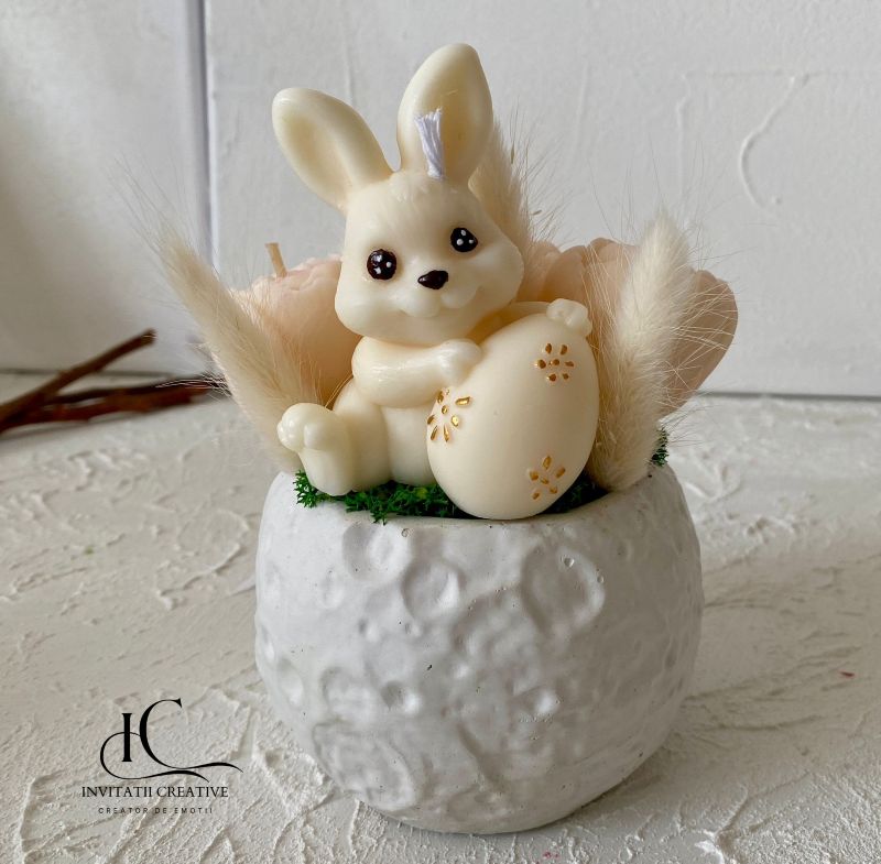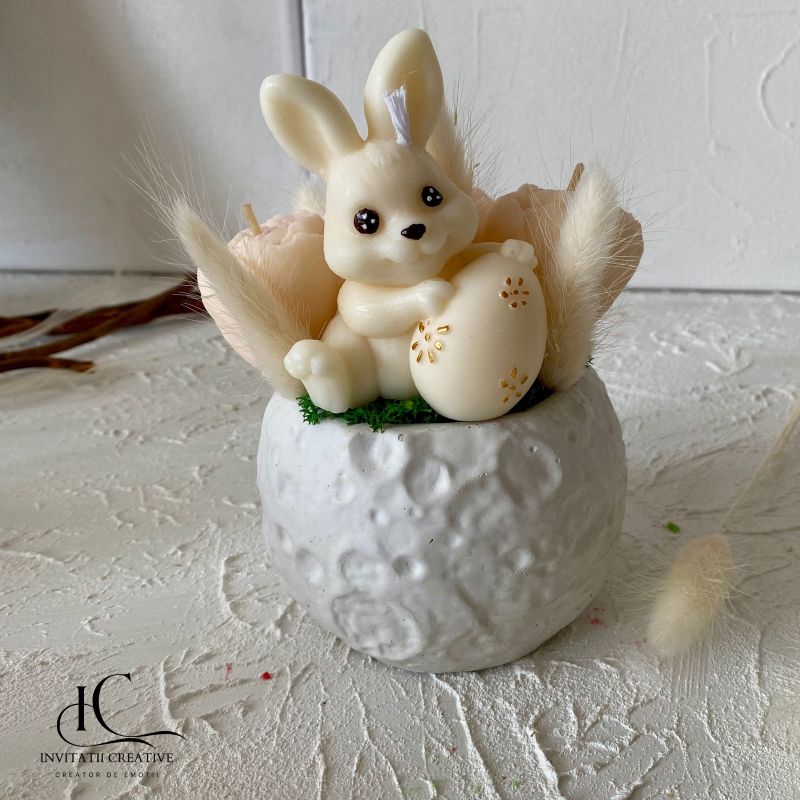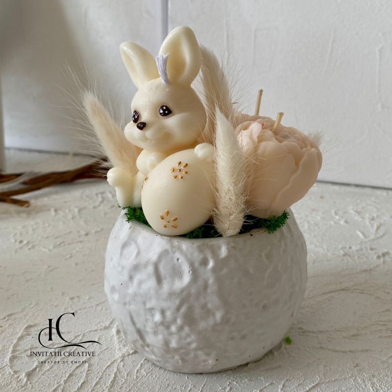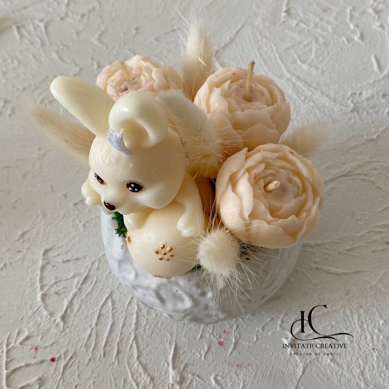 Decor Pascal Aranjament Lumanari Parfumate cu Bujori si Iepuras din ceara naturala de soia, parfumata cu note delicate florale premium si flori uscate.
