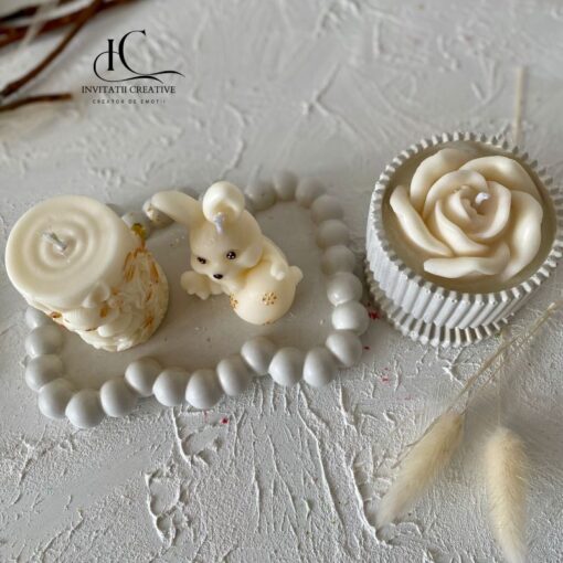 Set Cadou Lumanari Parfumate Sarbatori Pascale cu Iepurasi si Flori contine 3 Lumanari si un suport din ceramica: