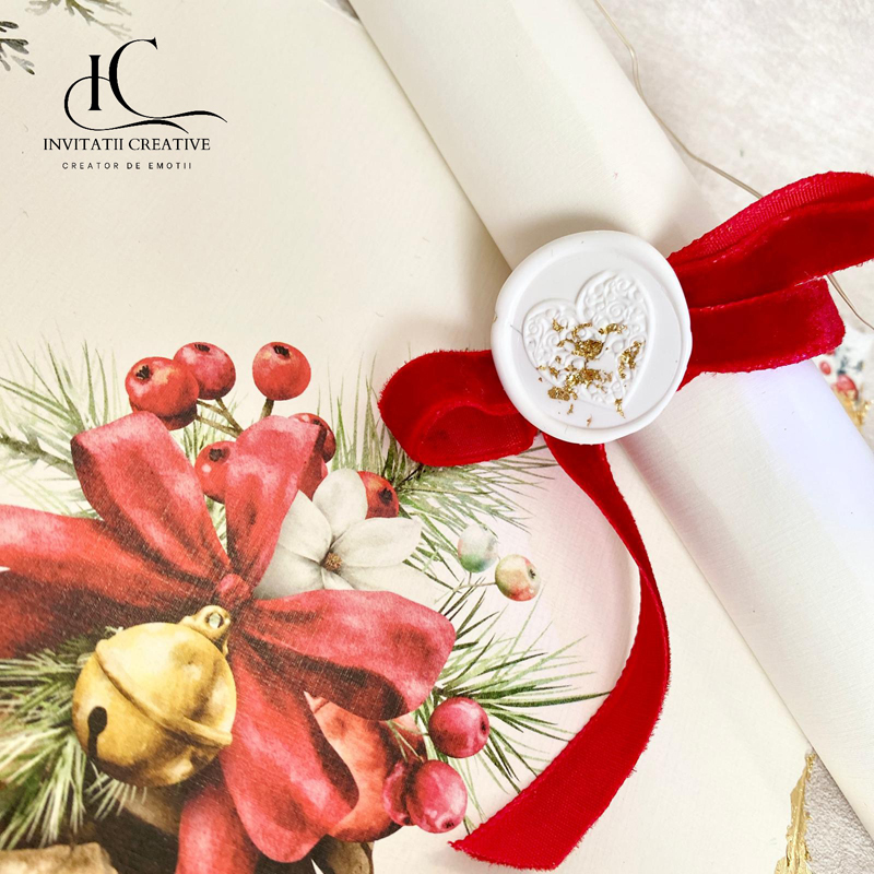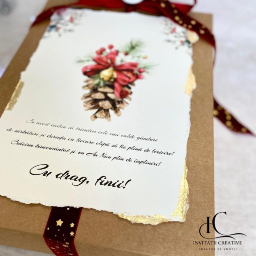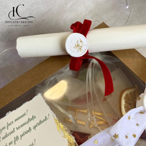 un papirus cu mesaj personalizat pentru nasi ( cu margini franjurate manual si cu foita aurie aplicata). Se inchide aceasta scrisoare cu un sigiliu de ceara.