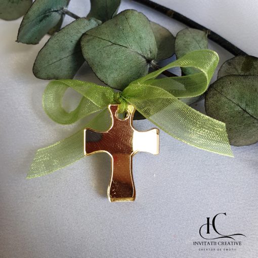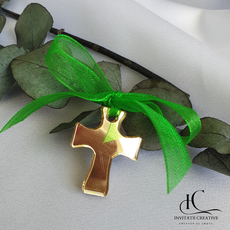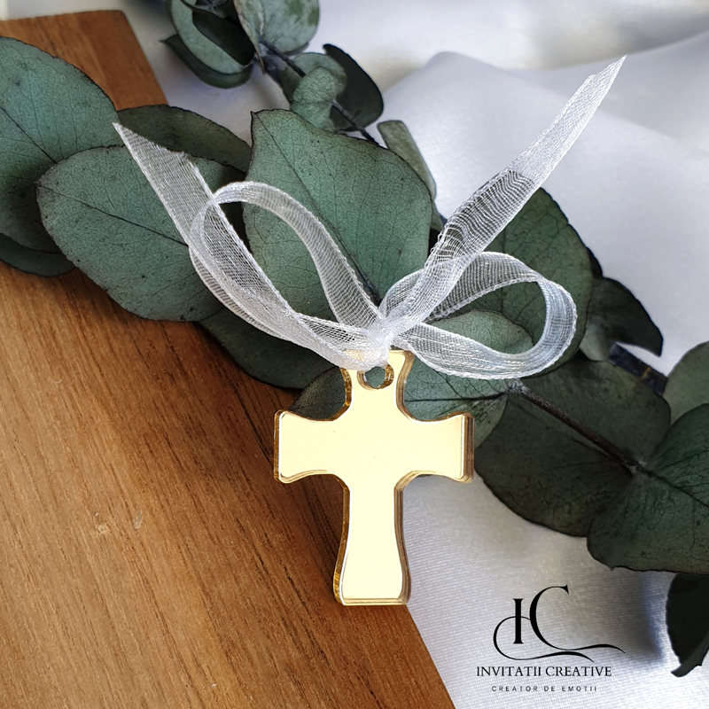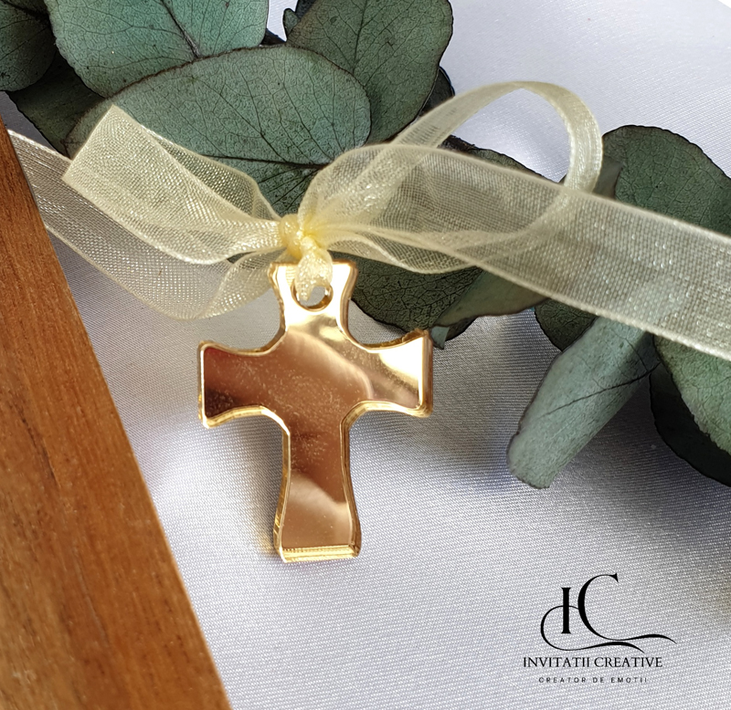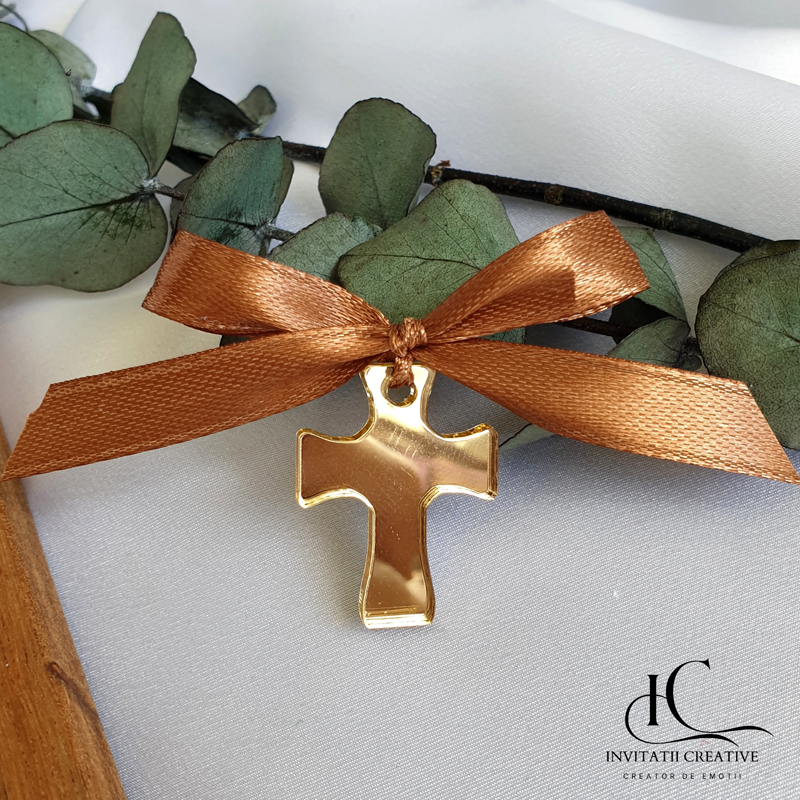 🌟 Ce este produsul? O cruciuliță decorativă, de 3 cm lungime și 2 mm grosime, realizată din pexiglas auriu, cu finisaje lucioase și delicate. Accesorizată cu panglică de satin sau organza, pentru un aer festiv și elegant. Cruciulitele vin într-o cutiuță,din care pot fi impartite cu drag in biserica.