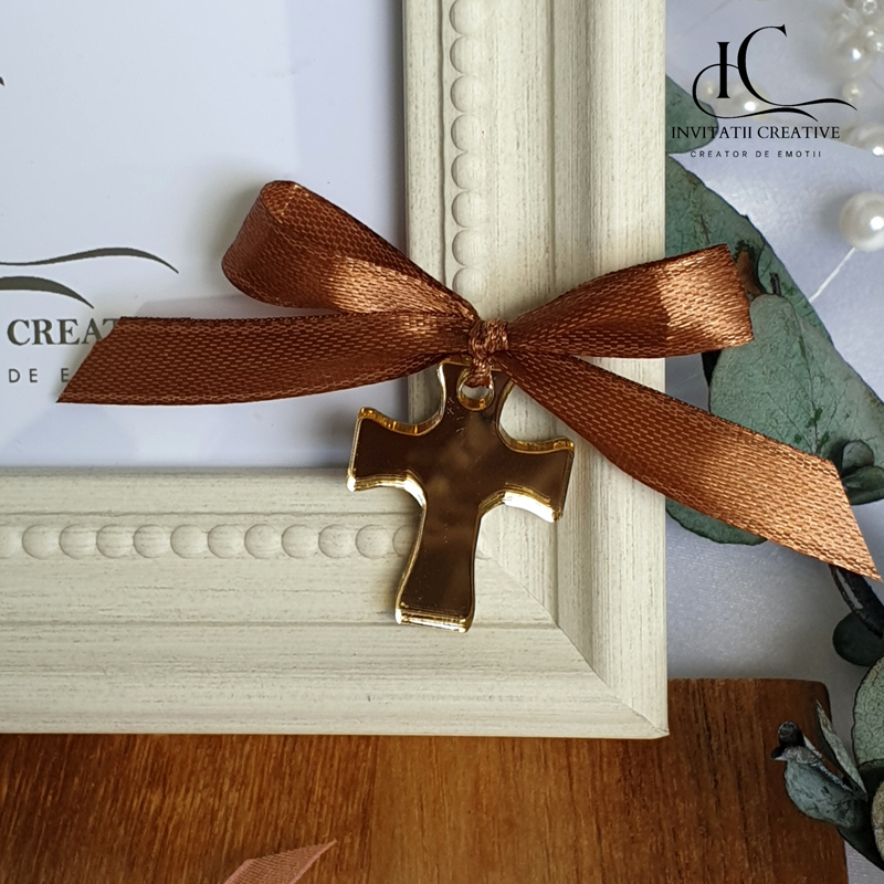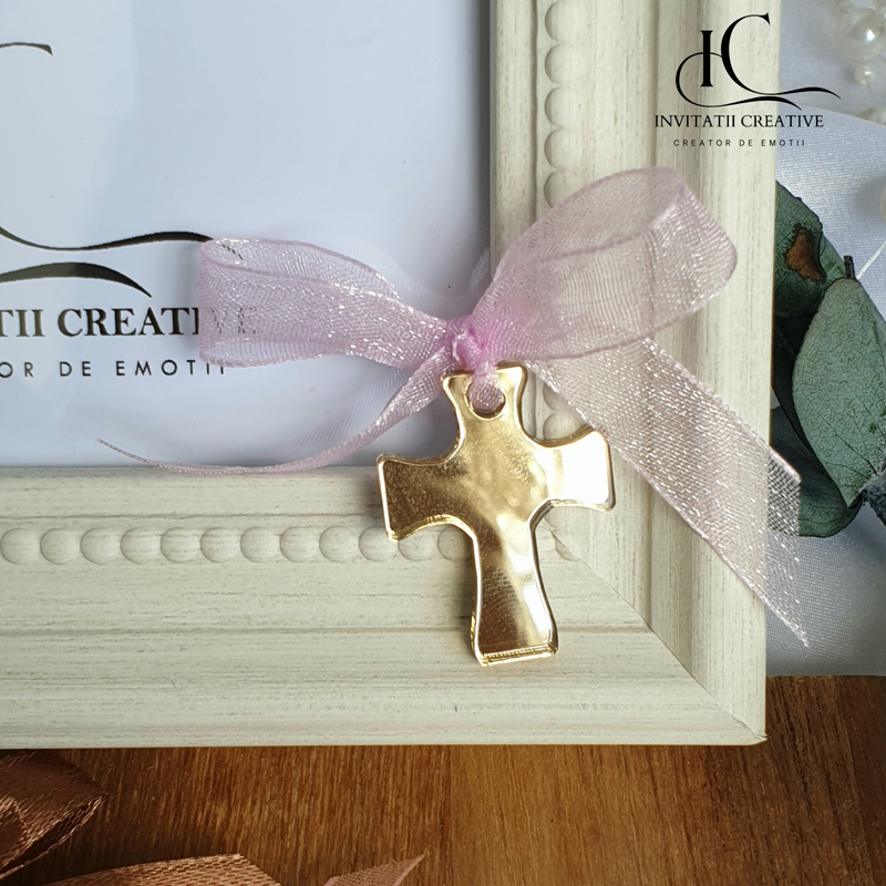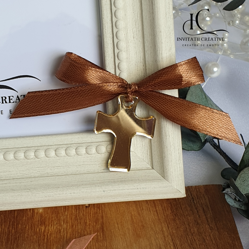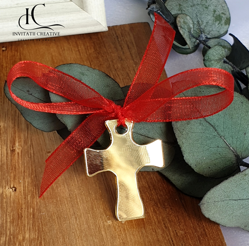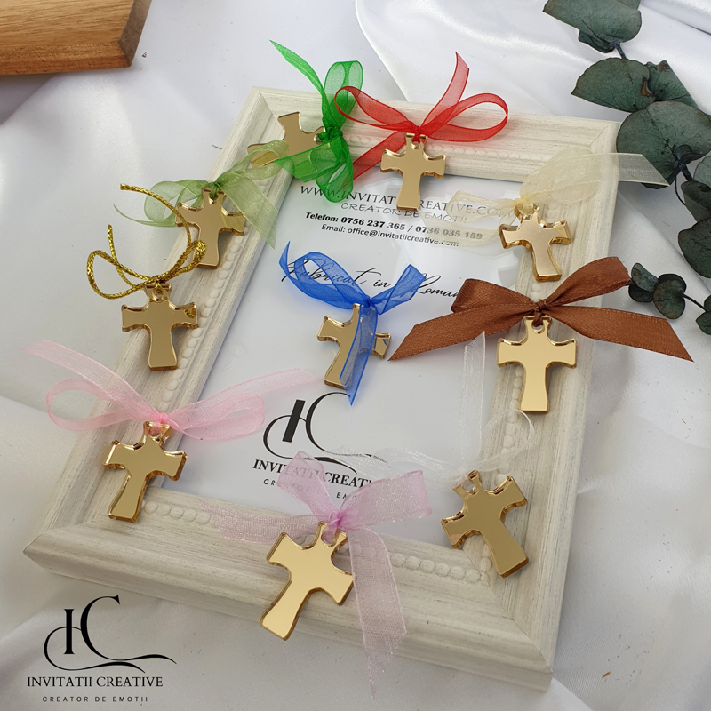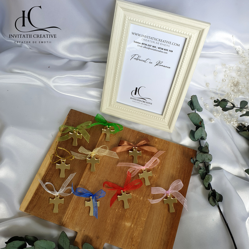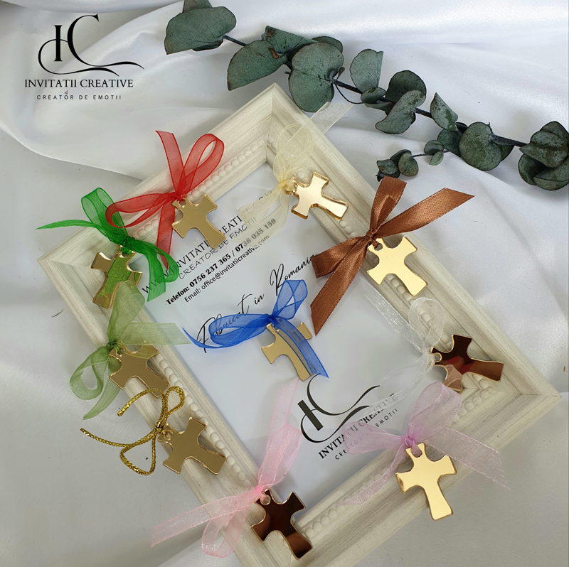 🌟 Ce este produsul? O cruciuliță decorativă, de 3 cm lungime și 2 mm grosime, realizată din pexiglas auriu, cu finisaje lucioase și delicate. Accesorizată cu panglică de satin sau organza, pentru un aer festiv și elegant. Cruciulitele vin într-o cutiuță,din care pot fi impartite cu drag in biserica.