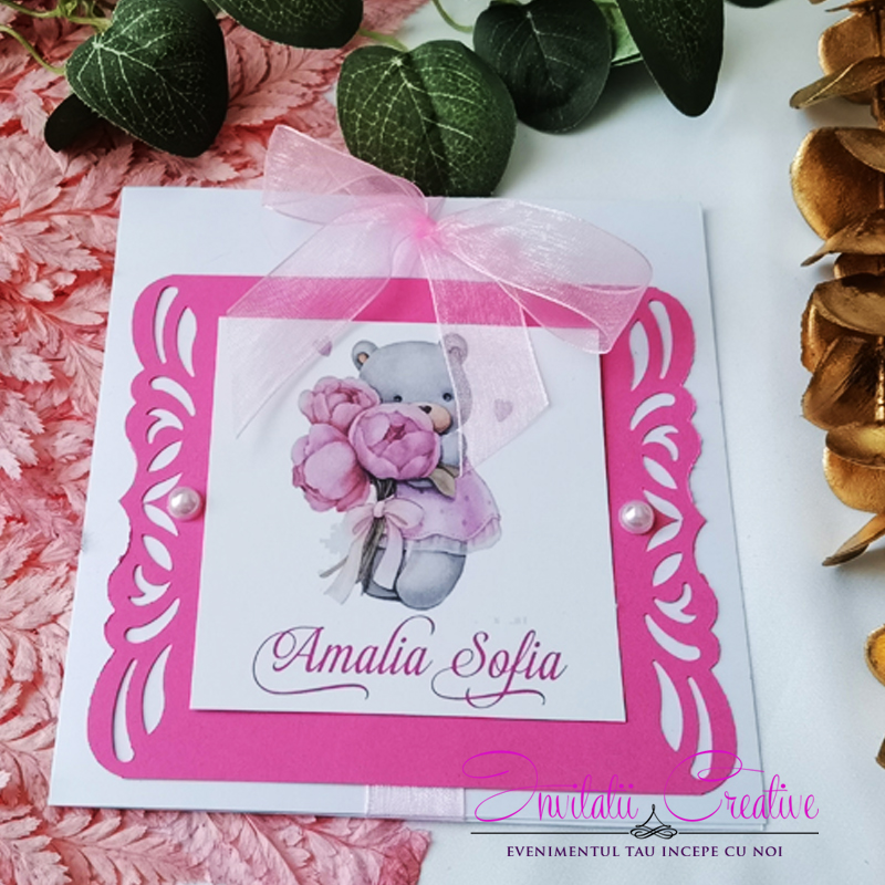 Invitatie Botez cu Model Lasercut Perlute si Ursulet cu Flori 2