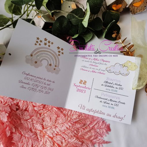 Invitatie Botez Curcubeu Roz Pastel cu Stelute Aurii