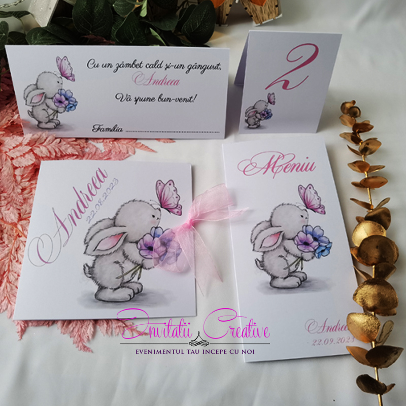 Invitatie Botez Iepuras Dragalas cu Flori si Fluture