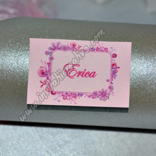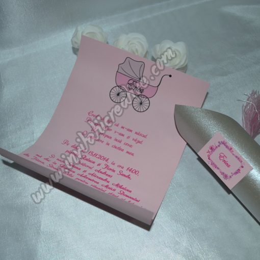 Invitatiile handmade papirus roz cu ciucuras si carucior sunt facute din carton roz mat (160 gr), imprimat cu un model carucior vintage. Ele sunt rulate si introduse in cartonul gri sidefat care este accesorizat cu un ciucuras si o eticheta personalizata cu numele fetitei tale.