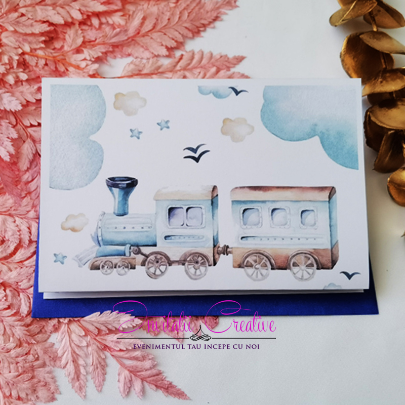 Invitatie Botez Watercolor Tematica Calatorie cu Trenul