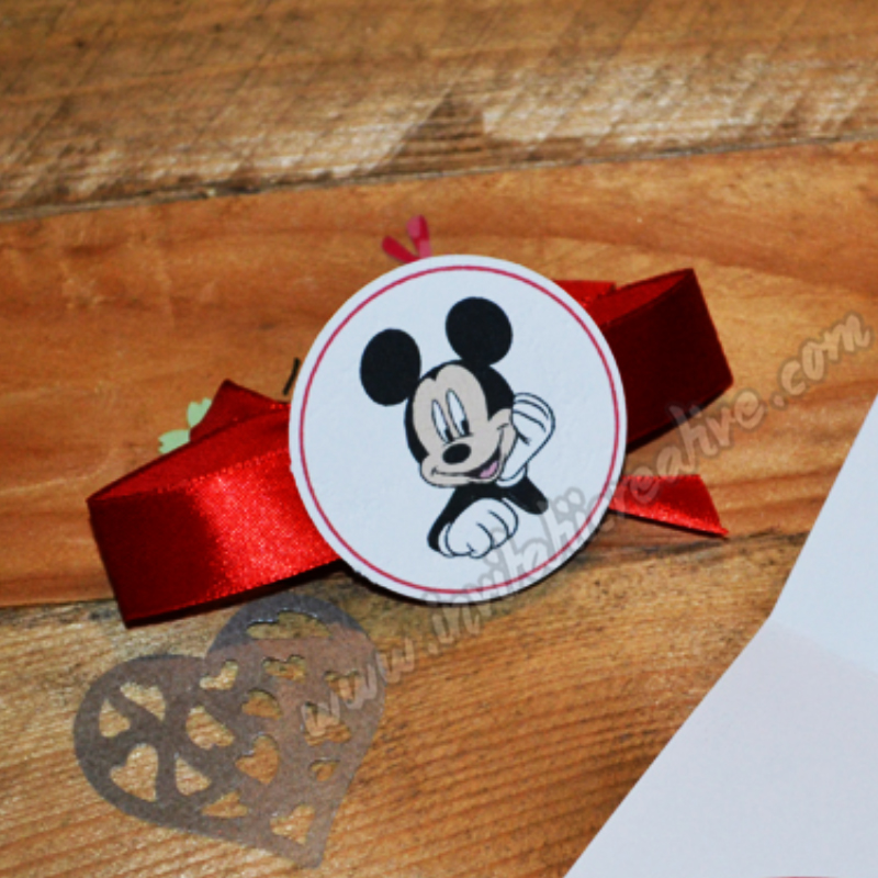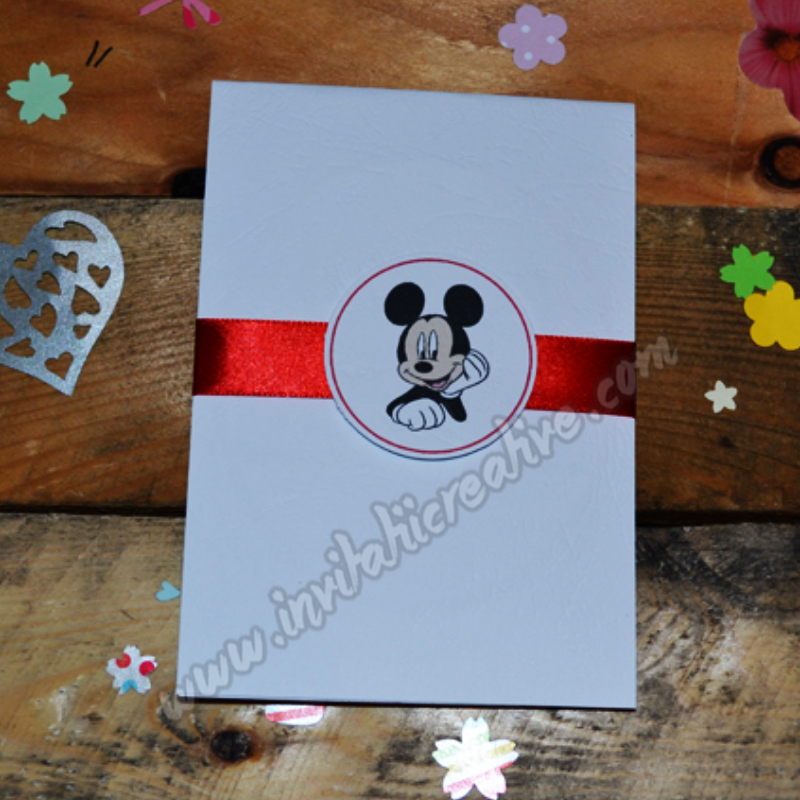 Invitatiile Mickey Mouse sunt facute din carton alb mat, si sunt accesorizate cu o fundita rosie din satin.