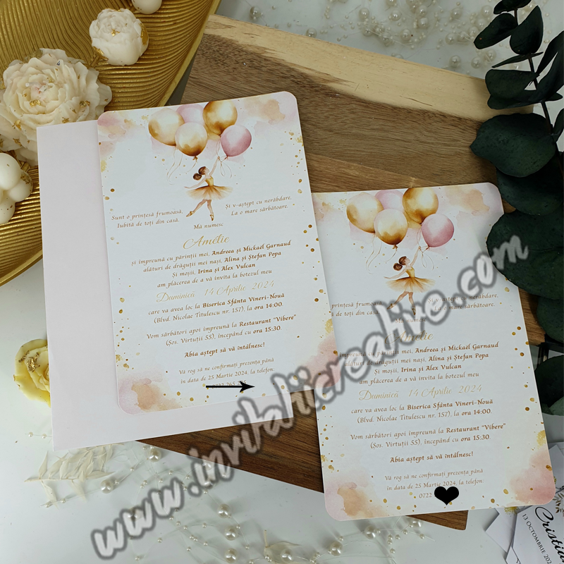 Invitatie de Botez cu Balerina si Baloane Watercolor