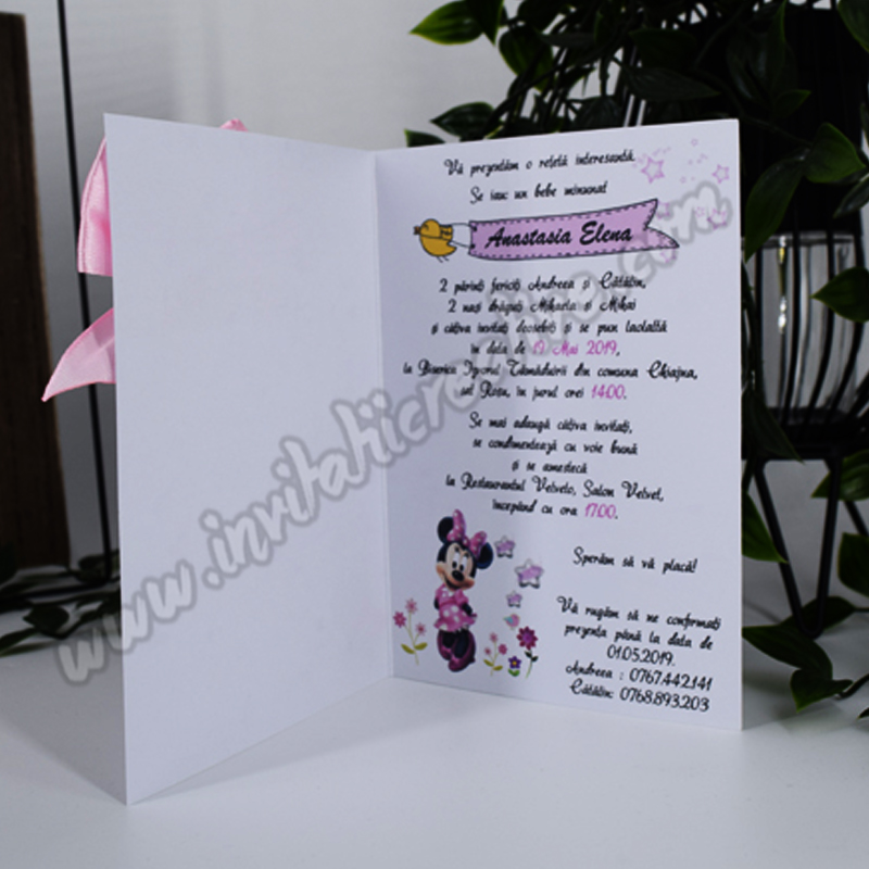 Invitatie de Botez Eleganta Minnie Mouse cu Fundita Roz si Perla