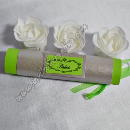 Invitatiile handmade papirus verde sunt facute din carton verde mat (160 gr), imprimat cu un model elegant negru. Ele sunt rulate si introduse in cartonul gri sidefat care este accesorizat cu o eticheta personalizata cu numele baietelului tau.