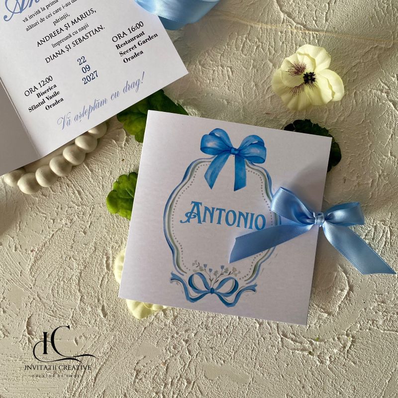 Invitatie de Botez Baiat Vintage Dior Ribbon este realizata din carton gros de 300 gr, cu print watercolor elegant.