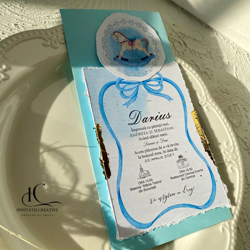 Invitatie de Botez Eleganta cu Foita aurie Carusel Bleu este realizata din carton gros de 300 gr, cu margini rupte manual, pentru un look nefinisat si elegant. Accesorizata cu foita aurie si Calut carusel.