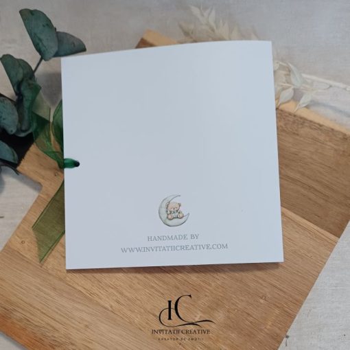Invitatiile de Botez unt realizate din carton gros de 300 gr. Invitatiile sunt pliate in doua si legate cu o panglica din organza verde asortata cu designul.