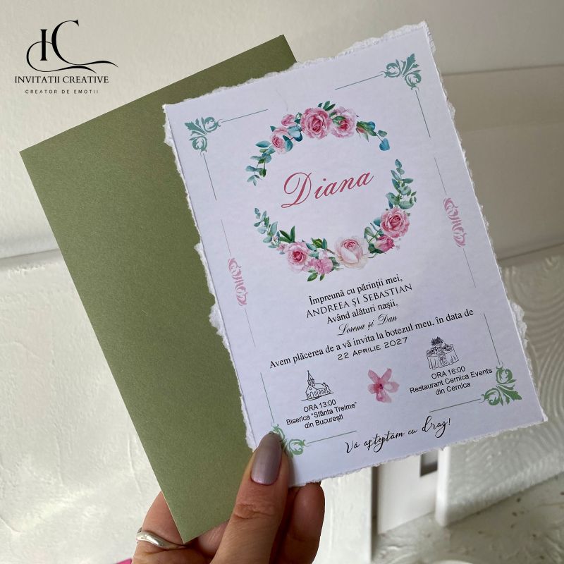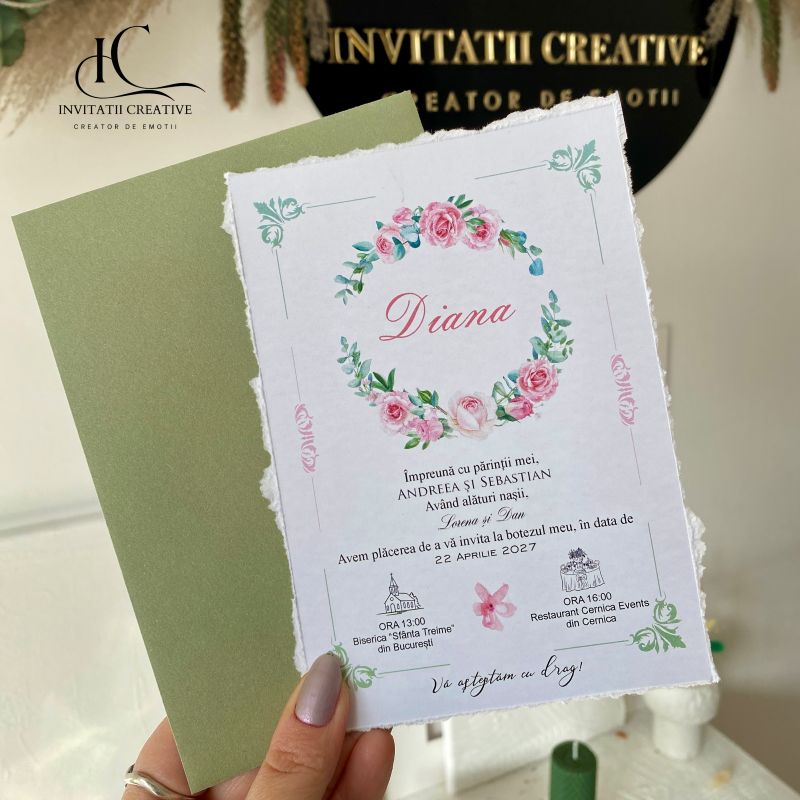 Invitatie Botez cu Motiv Floral Plic verde este realizata din carton gros de 300 gr, cu margini rupte manual, pentru un look nefinisat si elegant.