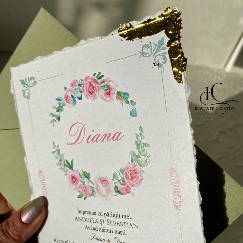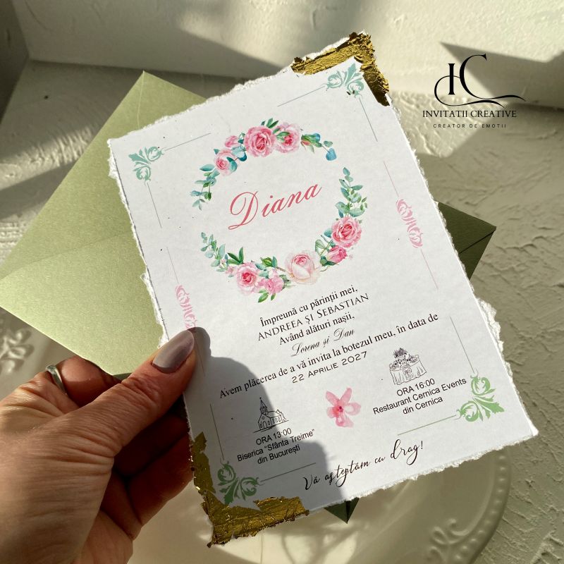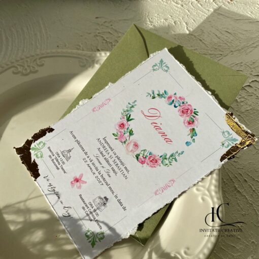 Invitatie Botez Foita Aurie si Motiv Floral Plic verde este realizata din carton gros de 300 gr, cu margini rupte manual, pentru un look nefinisat si elegant. Invitatia este accesorizata cu foita aurie.