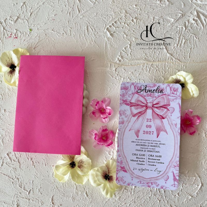 Invitatie Botez Motiv Safari Dior roz cu Fundita Eleganta este realizata din carton gros de 300 gr, cu print watercolor elegant.