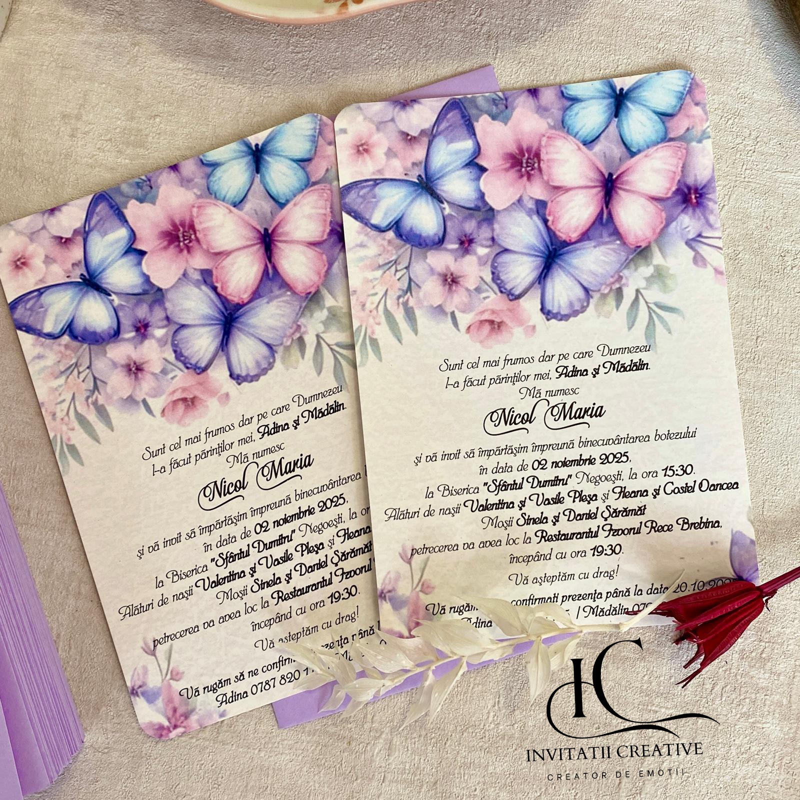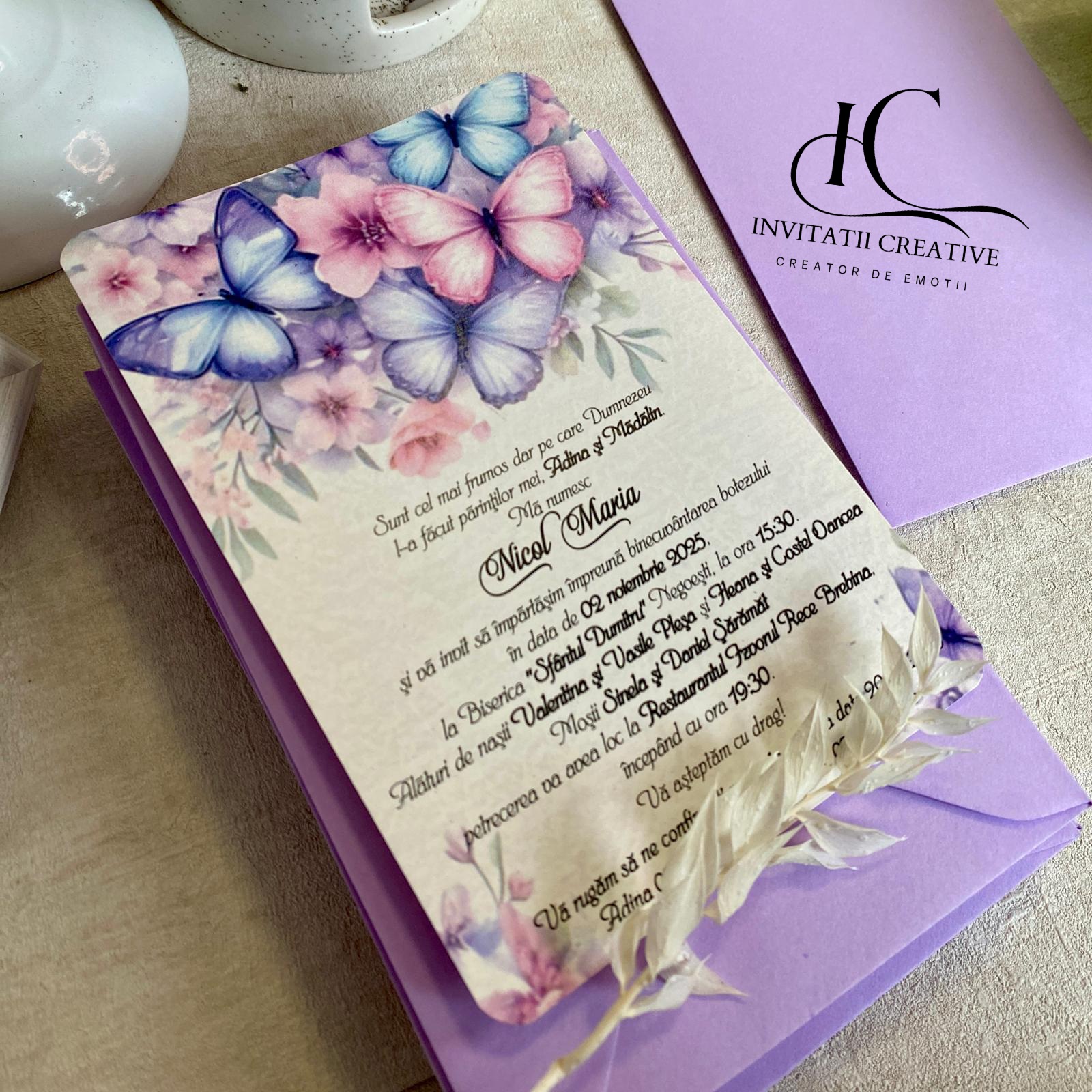 Invitatie de Botez cu Fluturi si Flori Roz-Lila