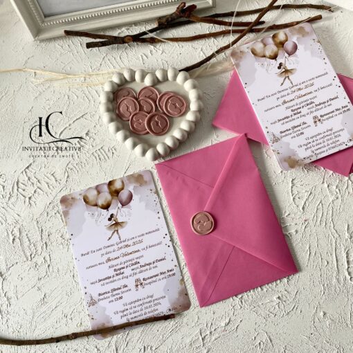 Invitatie de Botez Diafana Balerina cu Baloane si Sigiliu este realizata din carton gros lucios de 300 gr cu print elegant.