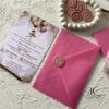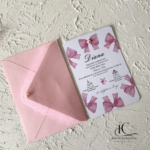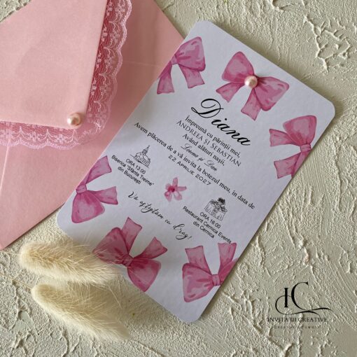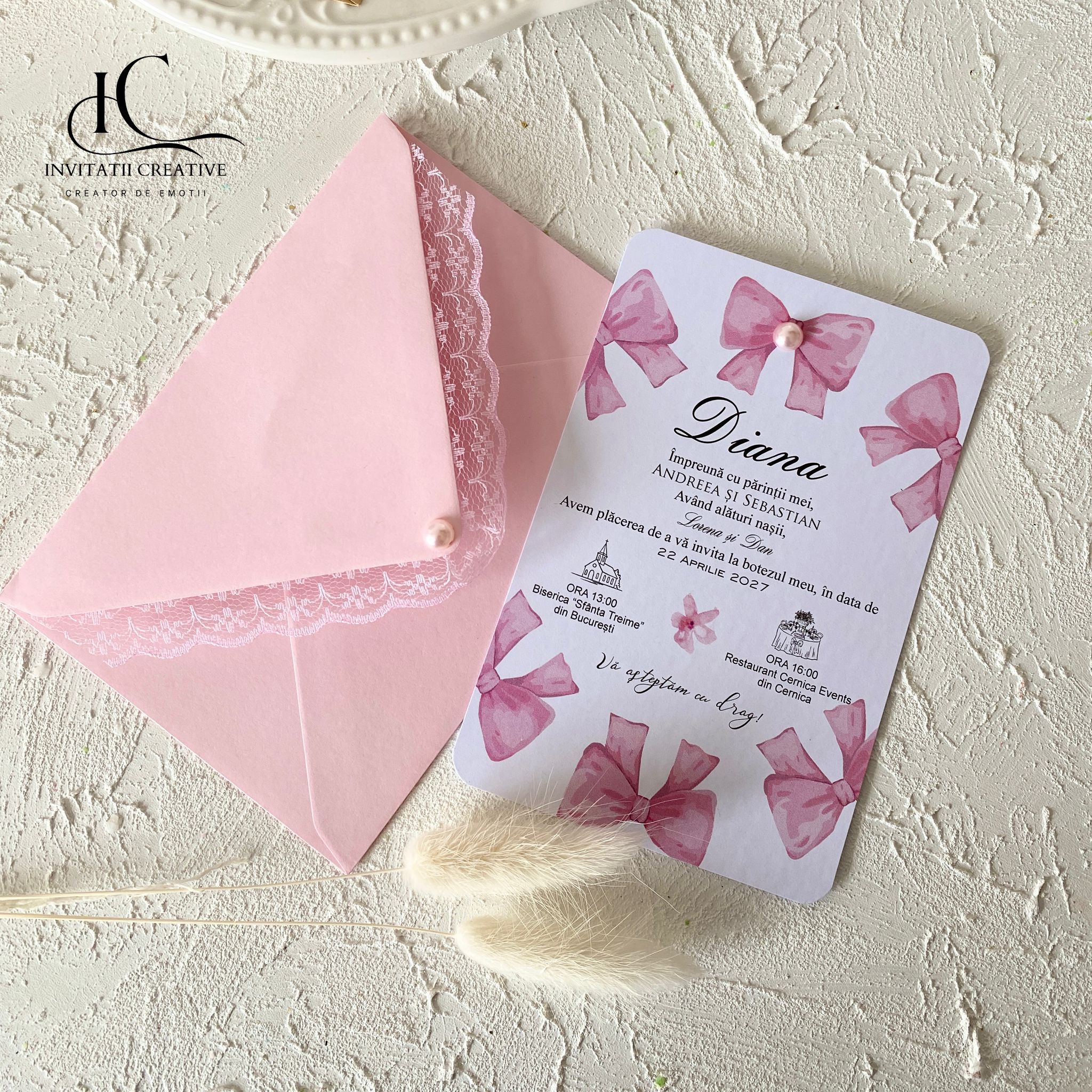 Invitatie de Botez Diafana cu Fundite Dantela Aplicata si Perla este realizata din carton gros de 300 gr, cu print watercolor elegant si perluta roz aplicata.