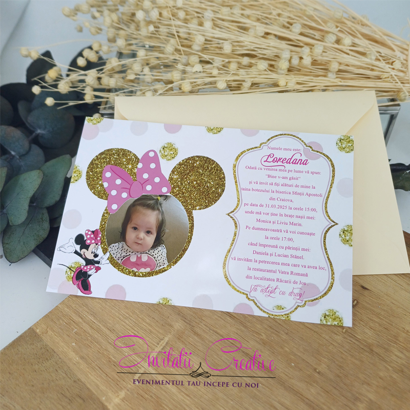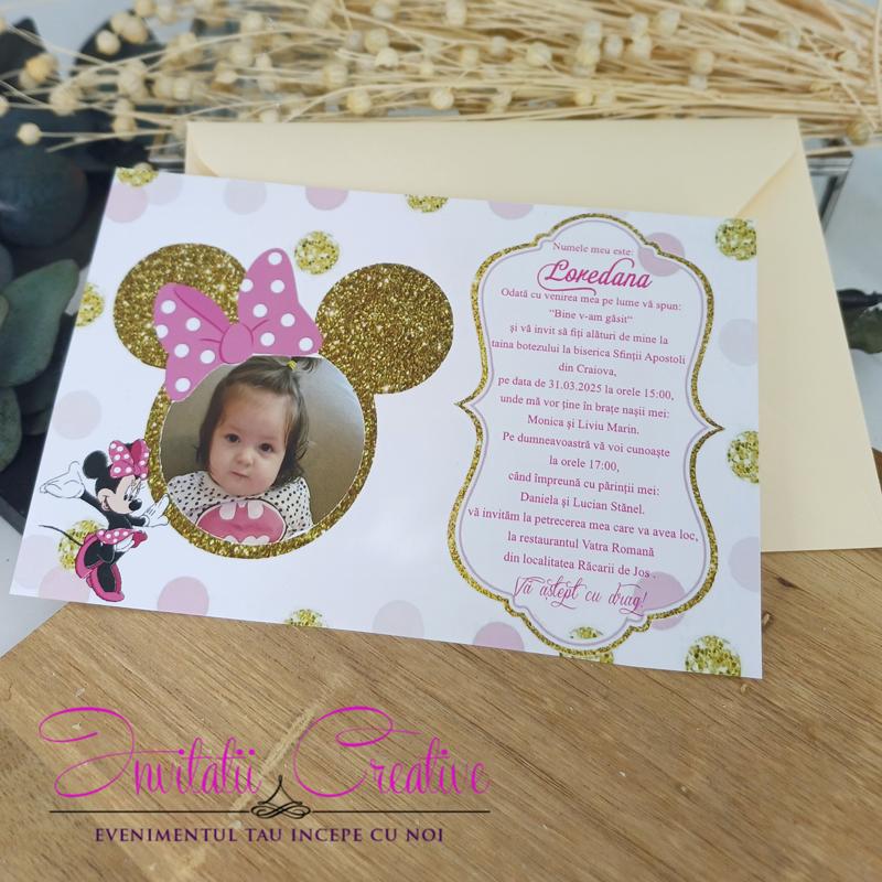 Invitatie de Botez Eleganta Minnie Mouse cu Poza Bebe.Invitatiile sunt realizate din carton special lucios de 200 gr, special pentru fotografii.