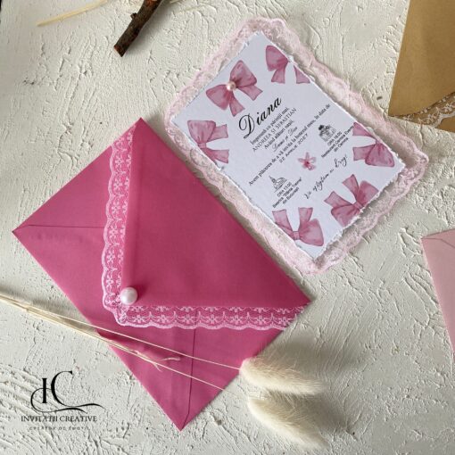 Invitatie de Botez Eleganta Ribbon cu Dantela Aplicata este realizata din carton gros de 300 gr, cu print watercolor elegant cu dantela si perluta roz aplicate.