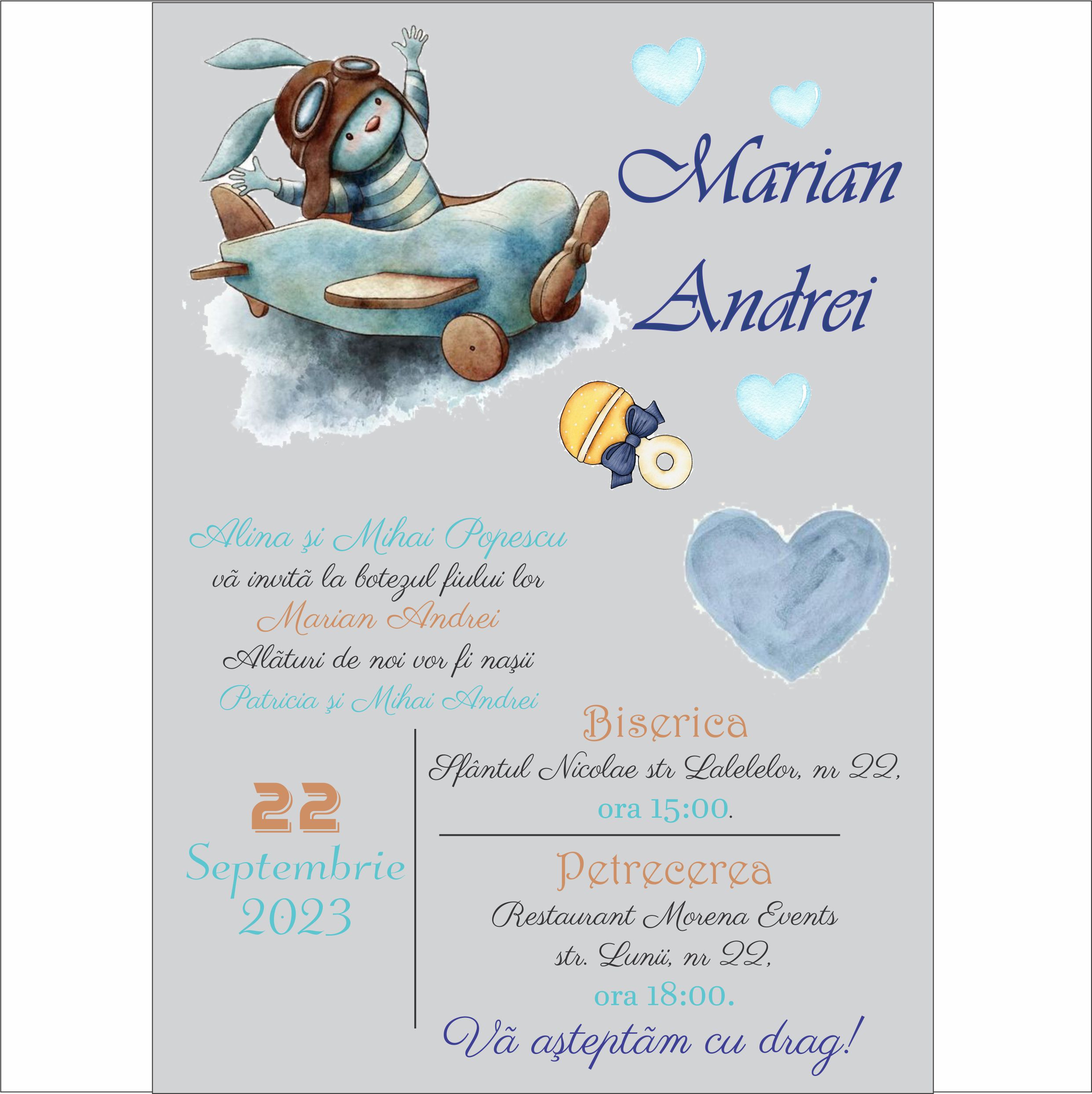 Invitatie Botez Digitala cu Iepuras Aviator Acuarela