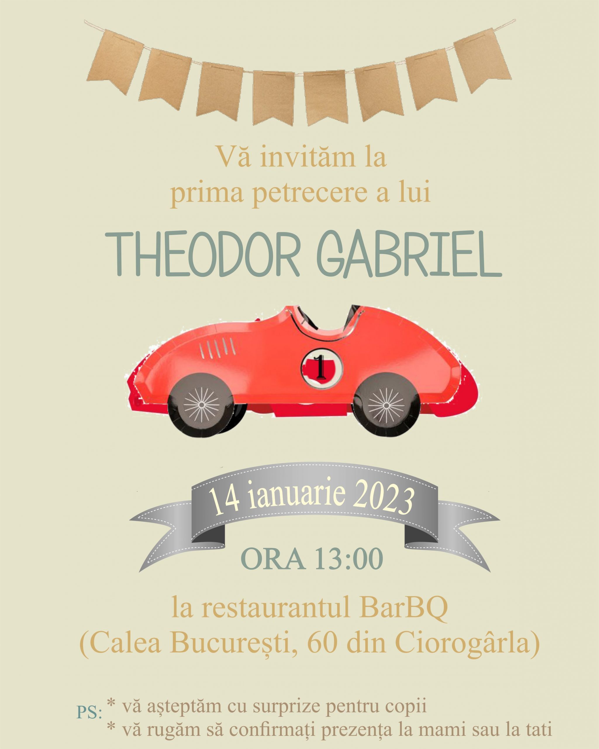 Invitatie de botez digitala cu masina de curse rosie
