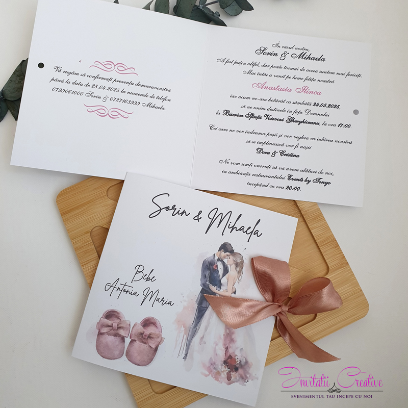 Invitatii pentru nunta si botez cu miri si botosei roz