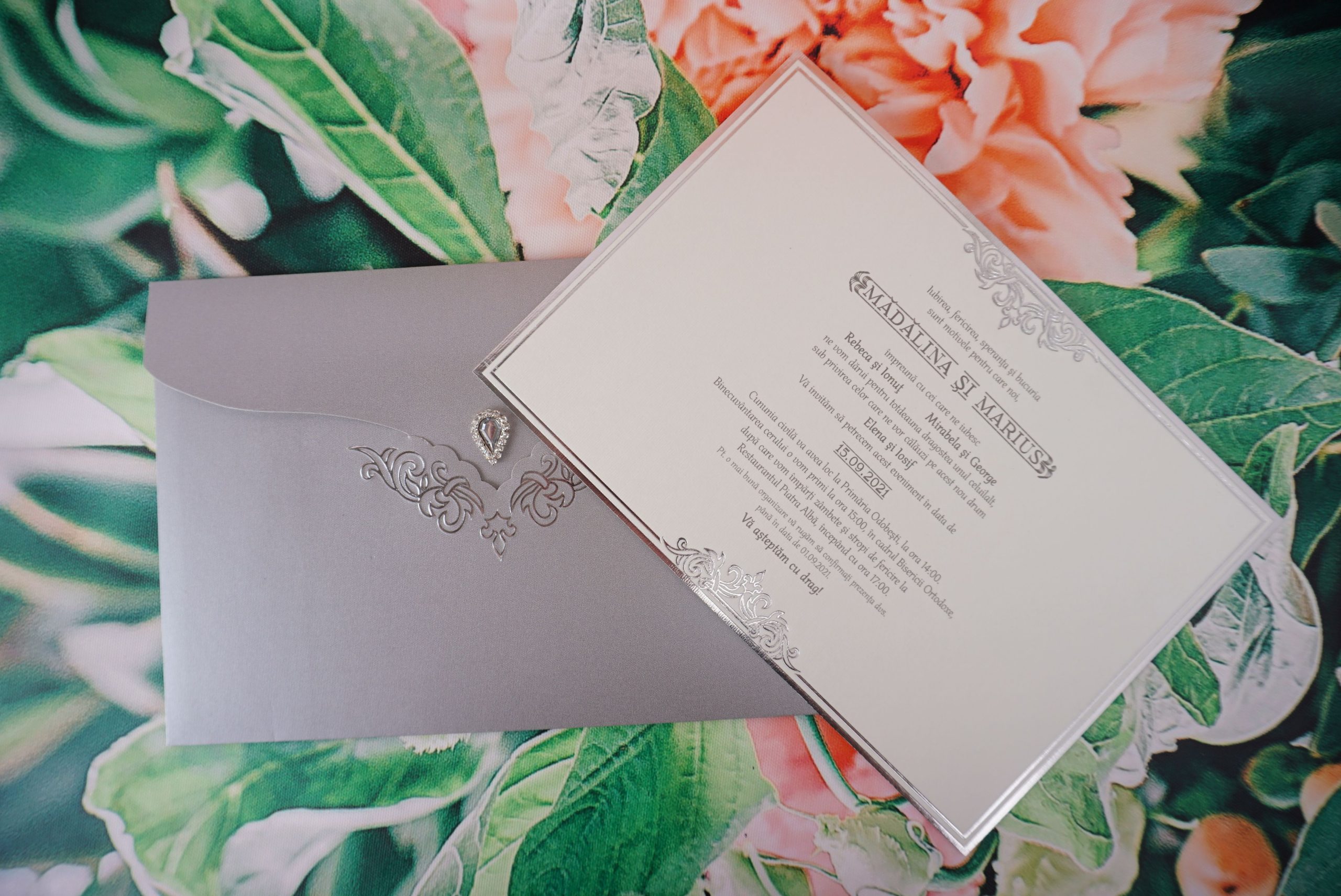 Invitatii de nunta confectionate dintr-un carton mat destinat textului cu margini argintii. Acesta se introduce intr-un plic clasic, elegant cu un accesoriu cu pietricele. Invitatia se personalizeaza cu textul pe care il doriti, corespunzator evenimentului dvs.