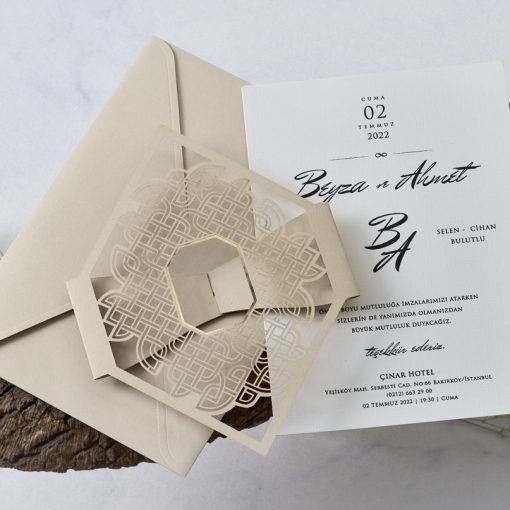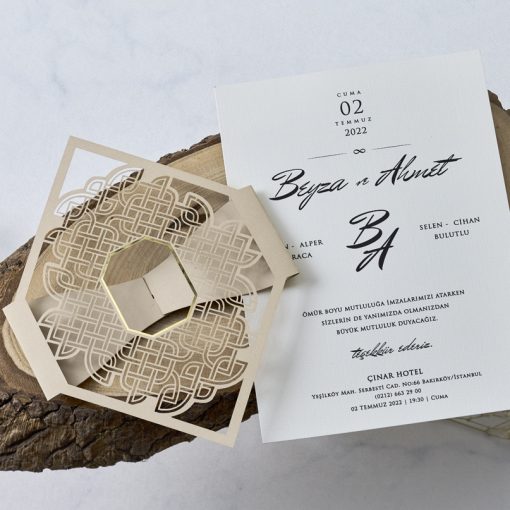 Invitatii de nunta confectionate dintr-un carton mat destinat textului. Acesta se introduce intr-o alta piesa, care prezinta decupaje, in relief. Nu se pliaza. Plicul este inclus în pret. Invitatia se personalizeaza cu textul pe care il doriti, corespunzator evenimentului dvs.