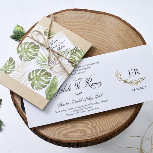 Invitatii de nunta confectionate dintr-un carton lucios destinat textului.Acesta se introduce intr-o alta piesa decupata pe ambele margini cu model cu frunze, legat cu sfoara care are un cardulet (cardul nu se printeaza, este destinat numelui persoanelor carora le daruiti invitatiile).